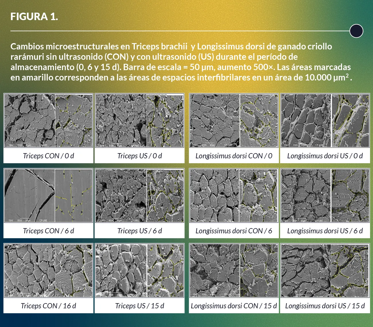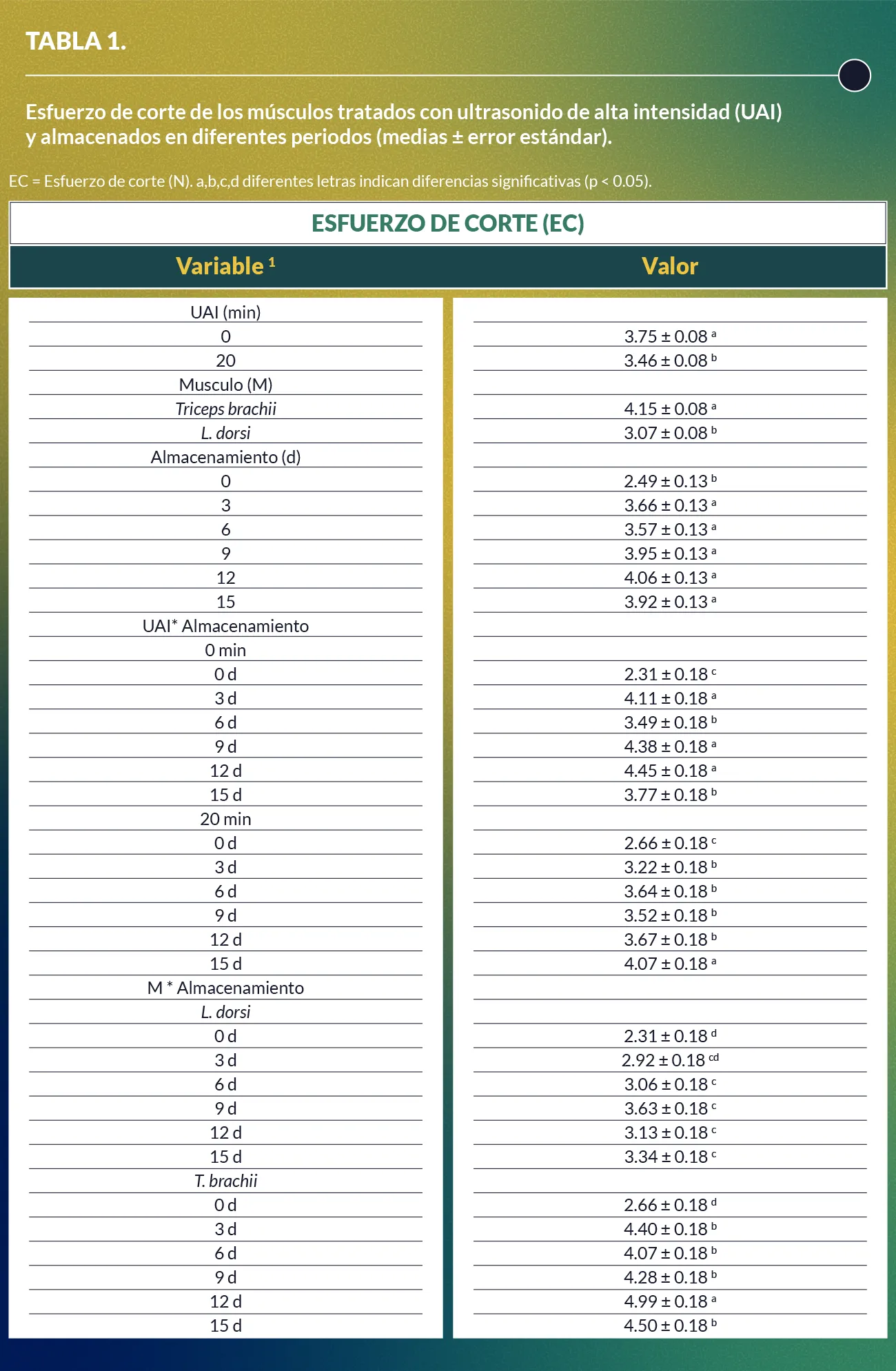 La aplicación de ultrasonido de alta intensidad durante 20 minutos a músculos Triceps brachii y Longissimus dorsi mostró una disminución de la fuerza de corte sin efectos negativos en el color. El uso de ultrasonidos a una frecuencia de 45 kHz y una intensidad de 11 W/cm2 durante 20 minutos ofrece una técnica alternativa para la tenderización de la carne. Se necesitan más investigaciones para caracterizar otras características de calidad de la carne del ganado Criollo Rarámuri ya que la información sigue siendo escasa.