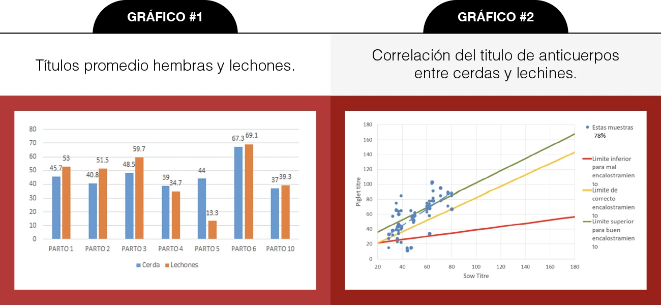 Transferencia de Inmunidad pasiva. Los siguientes gráficos 1 y 2 muestran los títulos al antígeno de Erysipelothrix sp en las hembras al parto y en los lechones 7 días post-parto, el gráfico # 2 muestra la correlación del 78% entre ambos valores.