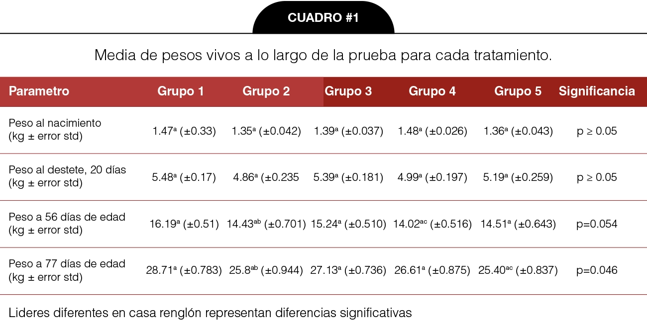 El cuadro # 1 describe los pesos medios a lo largo de la prueba en 4 pesajes hasta los 77 días de edad.