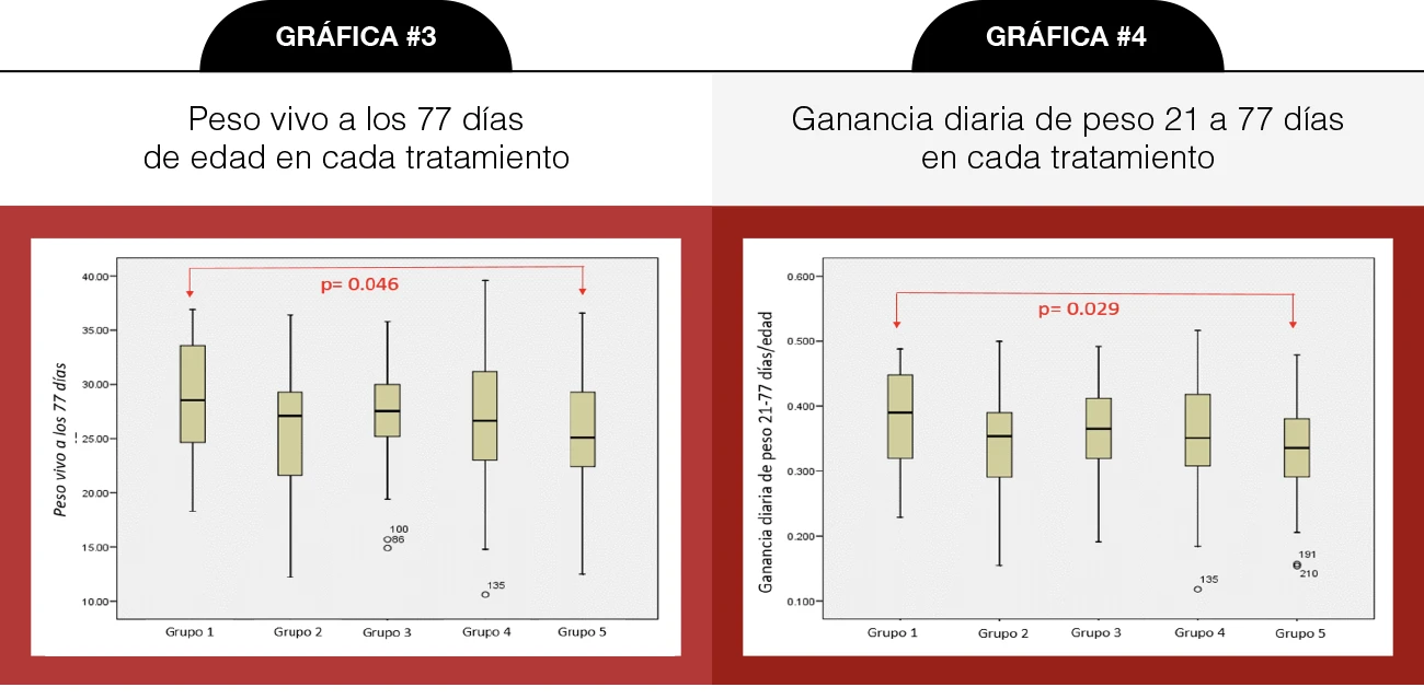 La gráfica # 3 muestra los pesos finales a 77 días de edad en cada tratamiento, La gráfica # 4 muestra la ganancia diaria de peso del destete a 21 días hasta el peso final de 77 días la diferencia estadística en ambas se expresa en la línea roja.