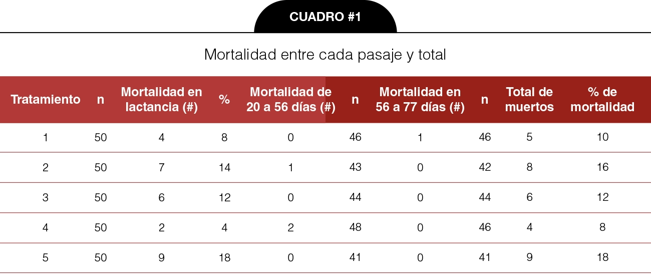 Los lechones fueron trasladados al sitio 2 alojando a todos en una misma nave hasta los 77 días de edad que fueron trasladados al sitio de engorda. Se realizaron 4 pesajes individuales a lo largo del flujo; al nacimiento, destete 21 días, 56 y 77 días en el sitio 2. Se registró la mortalidad de cada grupo y se realizó la necropsia de aquellos identificados dentro de las primeras 4 horas de muertos. Con los datos anteriores se calcularon las siguientes variables; peso vivo y ganancia diaria de peso (GDP) a intervalos de peso y total y mortalidad.