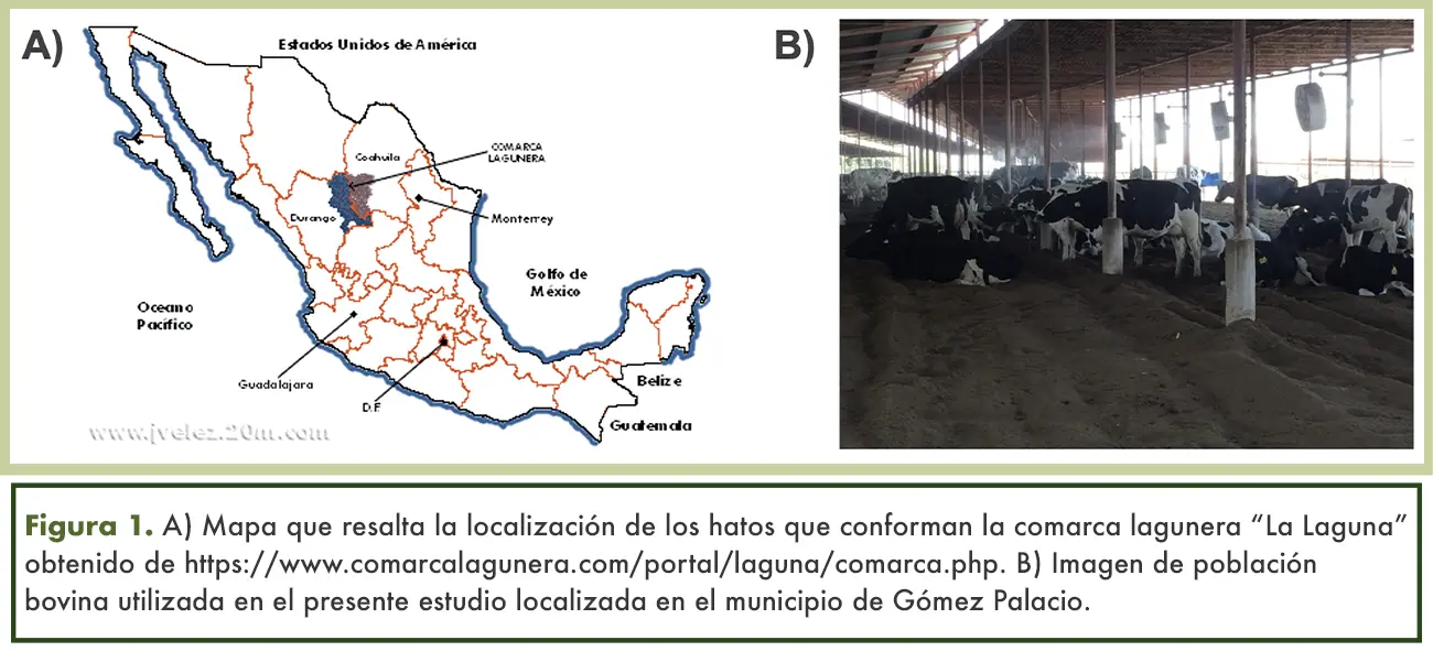 Hasta el 2021 se tiene en México un censo de casi 2.7 millones de cabezas de ganado bovino especializado en producción de leche, de las cuales, cerca de 523 mil cabezas se encuentran en la región de la comarca lagunera conocida coloquialmente como La Laguna, por lo que concentra una proporcion importante del inventario gandero nacional. Dicha región está constituida por 5 municipios de Coahuila (Torreón, Matamoros, San Pedro de las Colonias, Francisco I. Madero y Viesca) y 11 municipios de Durango (Gómez Palacio, Lerdo, Tlahualilo de Zaragoza, Mapimí, San Pedro del Gallo, San Luis Cordero, Rodeo, Nazas, Cuencamé de Ceniceros, General Simón Bolívar y San Juan de Guadalupe) (Figura 1) en donde en promedio se producen alrededor de 1.3 mil millones de litros de leche al año, convirtiéndola en una de las principales regiones productoras de leche del país (de la Cruz Torres, 2021).