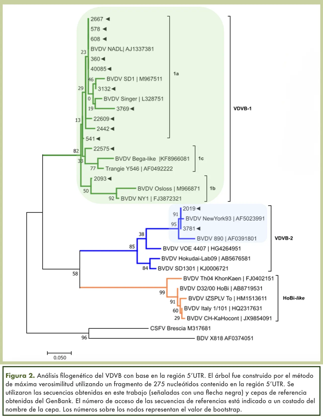 Las variaciones genéticas y antigénicas entre los subgenotipos del VDVB pueden detectarse mediante diferentes métodos como reacciones de anticuerpos monoclonales, pruebas de neutralización cruzada y comparación de secuencias de nucleótidos (Yesilbag et al. 2017). Sin embargo, los análisis filogenéticos de secuencias genómicas parciales o completas proporcionan información más detallada que los estudios basados en reacciones con anticuerpos y permiten la rápida detección de los subgenotipos del VDVB-1 y VDVB-2, así como la identificación de nuevas especies virales relacionadas con el VDVB (Ridpath et al., 1994). Para lo anterior, se han realizado estudios sobre genotipificación del VDVB utilizando diferentes regiones del genoma del VDVB como la 5’UTR, Npro y E2 (Vilcek et al., 2005); no obstante, las secuencias parciales o completas de la región 5’ UTR son las más utilizadas para la genotipificación de aislamientos del VDVB, esto permite la asignación de las cepas del VDVB en genotipos y subgenotipos (Yesilbag et al., 2017).