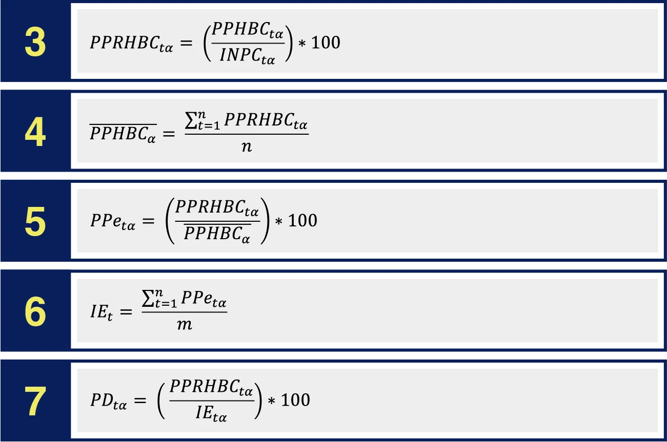 Enseguida se divide el precio real de cada mes (PPRHBCtα) entre su IE correspondiente (IEtα) para desestacionalizar el precio del huevo blanco (PDtα) del mes ???? en el año ????, tal como se indica en la ecuación (7).