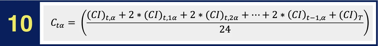 Con los datos de la nueva serie, producto de la ecuación (9), se obtuvo el componente cíclico (C_tα), mediante el promedio móvil centrado de doce meses, esto es: