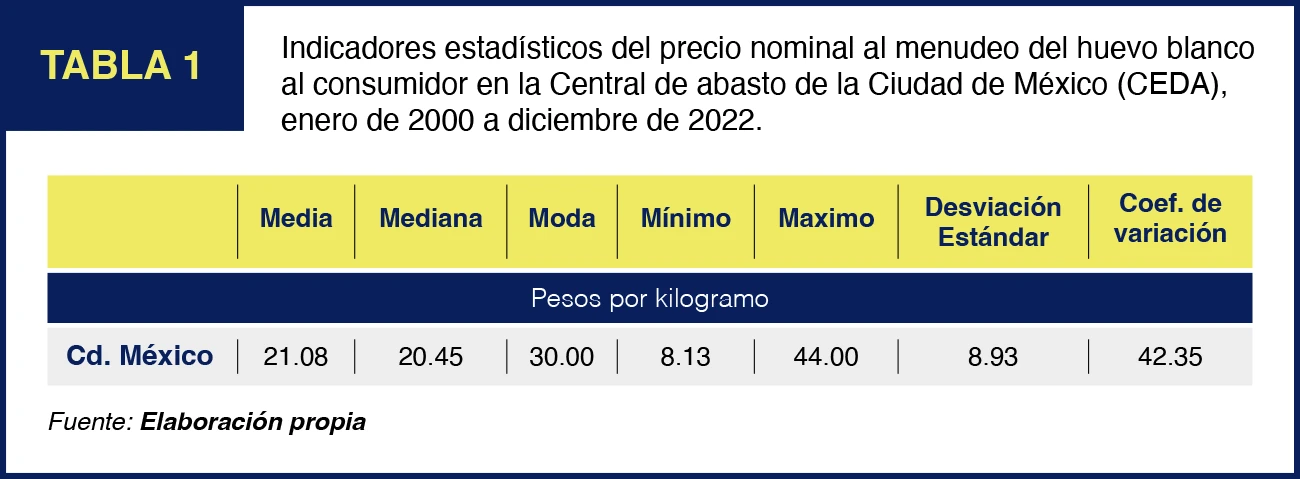 Para conocer el comportamiento de los PPHBC y calcular sus componentes, se utilizó una serie histórica de precios mensuales de huevo blanco al consumidor de la Central de Abastos de la Ciudad de México (CEDA-CDMX), considerada como la más grande del mundo y punto de referencia de los precios al consumidor y al mayoreo a nivel nacional (SADER 2023), así como los proporcionados por la Unión Nacional de Avicultores (UNA) y el Sistema Nacional de Información de Mercados (SNIIM) de la Secretaría de Economía (SE). La serie de los PPHBC comprende un periodo de 22 años (enero de 2000 a diciembre de 2022), dichos precios están expresados en pesos mexicanos nominales por kilogramo ($MXN kg-1).