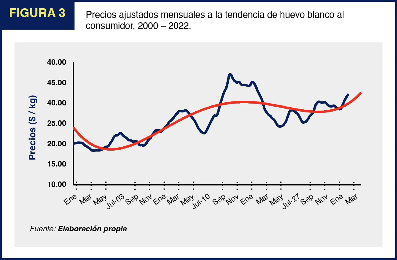 La serie indica una fuerte volatilidad en los precios del huevo blanco al consumidor en la central de abasto de la Ciudad de México, dicho precio es el punto de partida para los precios a nivel nacional, en el mes de julio del año 2000 se registró un precio mínimo de 8.13 pesos por kg y un precio máximo de 541% mayor al precio mínimo en el mes de julio de 2022.