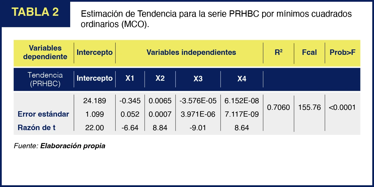 El coeficiente de Determinación (R2 = 0.706), indica que el modelo de regresión explica el 70.6 % de la varianza de la variable “Y” (PRHBC), por lo que se intuye que, si se agregan más variables al modelo, este valor puede aumentar, disminuyendo la varianza de la variable dependiente. Dado que el valor absoluto de la F calculada (155.76) es mayor que la F de tablas, se rechaza la hipótesis nula y se concluye que la variable “Y” (PRHBC), depende de la variable “X” (tiempo), es decir es altamente significativo (Tabla 2).