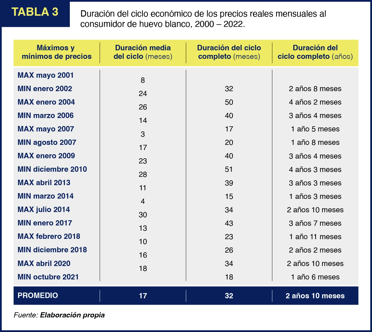La duración de un ciclo en la fluctuación del precio va de un máximo a un mínimo; o bien, de un mínimo a un máximo; con base en esto, en el periodo de 2000 a 2022 se observan 8 ciclos completos para los precios del Valle de México: el primero va de mayo de 2001 a enero de 2002, el segundo va de enero de 2004 a marzo de 2006 y; finalmente, el octavo ciclo va de abril de 2020 a octubre de 2021. En promedio, la duración del ciclo fue de 34 meses (2 años 10 meses) (Tabla 3).