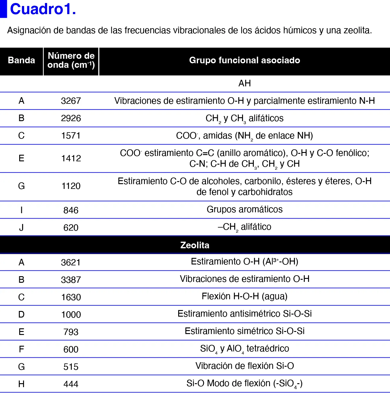 En general, los espectros FTIR-ATR mostraron que los AH contienen una amplia variedad de grupos funcionales ácidos como carboxílicos, carbonilos, hidroxilos y fenólicos (dominios hidrofílicos), así como grupos alifáticos, aromáticos y metilo (dominios hidrofóbicos) (Cuadro 1). Estos grupos funcionales se consideran sitios potenciales para la unión de contaminantes (12,21), y para la formación de complejos con ciertos cationes metálicos (14). Otros estudios indican que los grupos fenólicos asociados a OH, C-O, C=O forman enlaces de hidrógeno con ciertos compuestos orgánicos e inorgánicos (22–24). Por ejemplo, Vázquez-Durán et al (2021) indicaron que el OH podría establecer enlaces de hidrógeno con los átomos de oxígeno en los grupos metoxi, carbonilo y éter de la molécula AFB1.