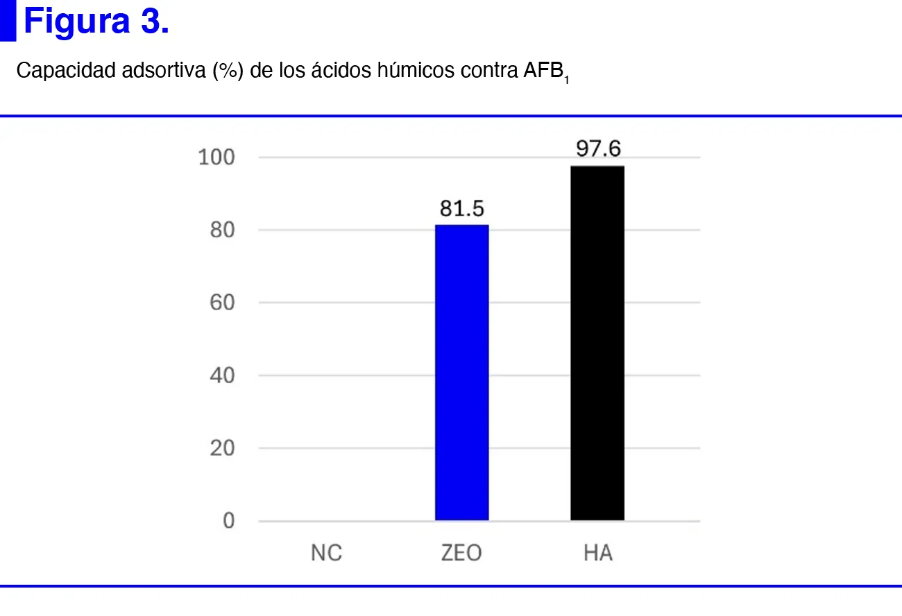Respecto al porcentaje de adsorción de AFB1 en el modelo in vitro. Los AH tuvieron una capacidad adsortiva del 97.6%, en comparación al 81.5% de adsorción de una zeolita utilizada como control (Figura 3). Comparando nuestros resultados, en un estudio in vitro con 100 mg/ml de inclusión de AH y un reto de 20 ppb de AFB1, se observó una adsorción de AFB1 del 90.50 % (39). Además, Ye et al (2009) investigó la capacidad adsortiva de AFB1 en presencia de diferentes niveles de AH, bajo diversos niveles de pH, tiempos de interacción y concentraciones de AFB1. Reportando, que los mayores porcentajes de adsorción fueron 88.12 % a pH 7 y 76.36 % a pH 8.