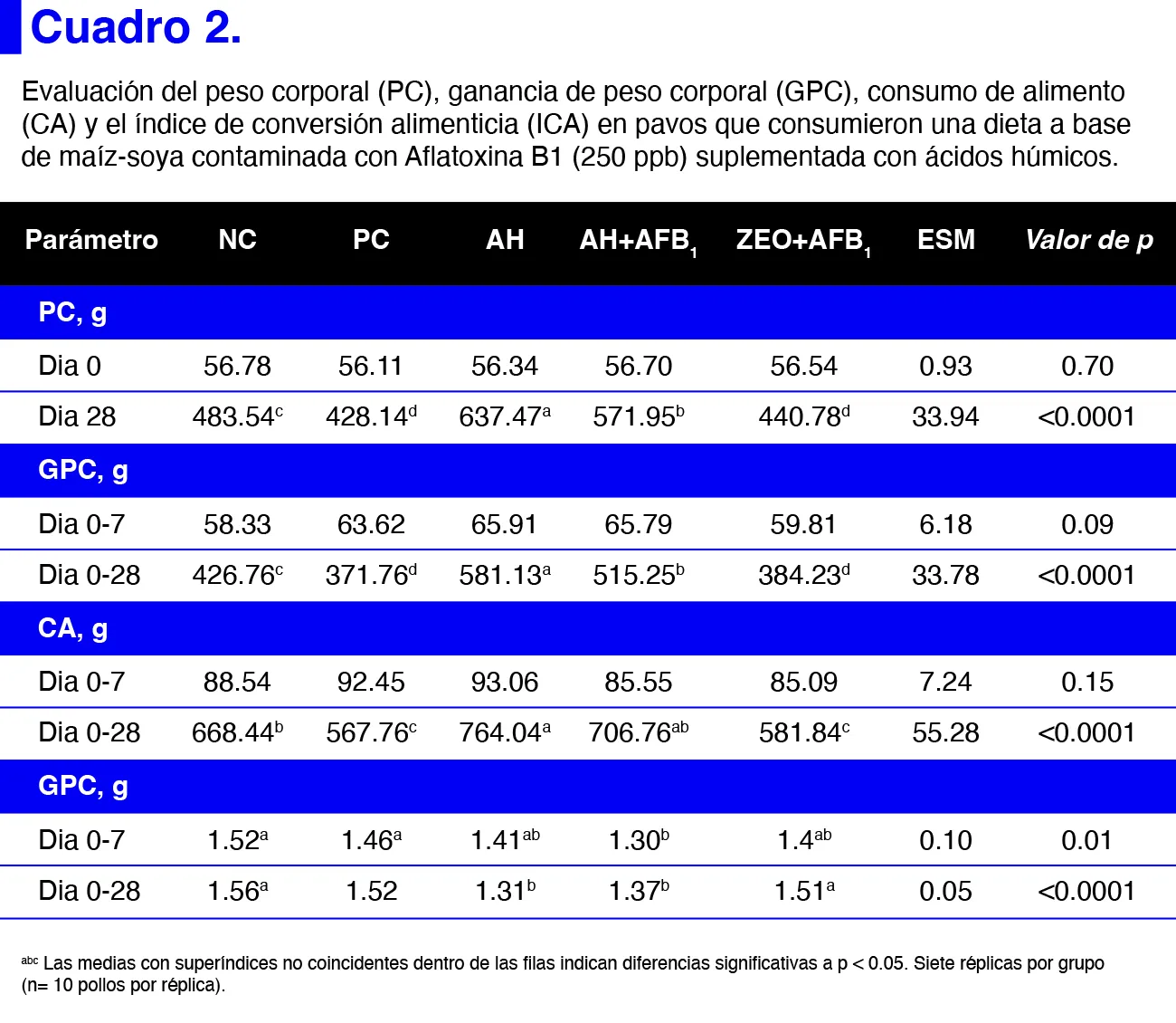 El cuadro 2 resume las diferencias en el peso corporal (PC), la ganancia de peso corporal (GPC), el consumo de alimento (CA) y el índice de conversión alimenticia (ICA) en pavitos que consumieron una dieta a base de maíz-soya contaminada con aflatoxina B1 (AFB1) (250 ppb de AFB1) suplementada con AH. a los 28 días, el PC de ambos tratamientos con AH (637.47 y 571.95 g para AH y AH + AFB1, respectivamente) fue mayor que el de los tratamientos con AFB1 (428.14 g) (P<0.0001). Al comparar el período de 0 a 28 días, la GPC de ambos tratamientos con AH se mantuvo significativamente más alta (581.13 y 515.25 g para AH y AH + AFB1, respectivamente) en comparación con el tratamiento control positivo (371.76 g) (P<0.0001). Respecto al CA de 0 a 28 días, fue significativamente mayor en ambos tratamientos con AH (764.04 y 706.76 g para AH y AH + AFB1, respectivamente) en comparación con el tratamiento control positivo (141.75 g) (P<0.0001). Finalmente, el ICA de 0 a 28 días fue significativamente mayor en el control negativo (1.56), control positivo (1.52) y ZEO + AFB1 (1.51) en comparación con ambos tratamientos con AH (1.31 y 1.37 para AH y AH + AFB1, respectivamente) (P<0.0001), lo que indica una mejor ICA en los tratamientos suplementados con AH. En general, los pavitos suplementados con HA mostraron un aumento en el PC, la GPC, el CA y el ICA. Estos resultados son consistentes con hallazgos previos en pollos de engorde suplementados con sustancias húmicas derivadas de lombricomposta donde se observó una mejora en los parámetros productivos (15,41).