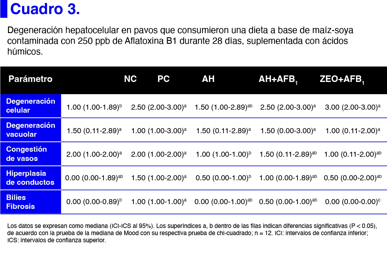 El cuadro 3 resume las respuestas de degeneración hepatocelular en pollos de engorde que consumieron dietas contaminadas con AFB1 y suplementadas con AH. El tratamiento control positivo (AFB1), mostró aumentos significativos (P < 0.05) en la degeneración celular y vacuolar, y fibrosis en comparación con el control negativo. En los pollos tratados con AH, se encontró una menor congestión vascular (P < 0.05) en comparación con los grupos control positivo y negativo, y una menor hiperplasia de los conductos biliares en comparación con el grupo control positivo. El agrandamiento y aumento de peso observados en el hígado pueden atribuirse a una acumulación de lípidos, lo que conduce a una condición conocida como hígado graso friable en pollos afectados por aflatoxicosis (42). Adicionalmente, se cree que la respuesta inflamatoria es un mecanismo mediante el cual el organismo responde a la degeneración y vacuolación de los hepatocitos causada por la exposición a AFB1 (43).