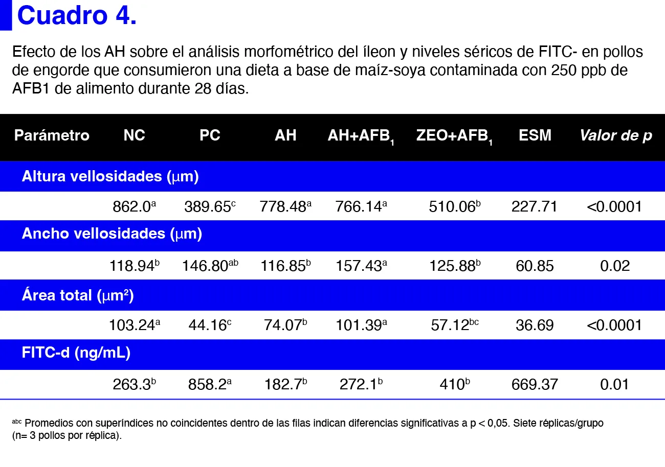 Los resultados del efecto de AH sobre el análisis morfométrico y los niveles séricos de dextrano de isotiocianato de fluoresceína (FITC-d) en pavitos que consumieron una dieta contaminada con 250 ppb de AFB1 durante 28 días se resumen en el cuadro 4. Los pavitos en los tratamientos NC, AH y AH + AFB1 mostraron un aumento significativo en la altura de las vellosidades, seguido de los pavitos en el tratamiento ZEO + AFB1. Por el contrario, el tratamiento PC mostró la altura de vellosidades más baja. Los pavitos en los tratamientos NC y AH + AFB1 mostraron el área total más alta, seguidos de los pavitos suplementados con AH y ZEO + AFB1. Mientras tanto, el tratamiento PC tuvo el área total más baja y mostró la concentración sérica más alta de FITC-d en comparación con el resto de los tratamientos experimentales. El aumento de la altura y el ancho de las vellosidades, indicadores de una mejor absorción de nutrientes, corrobora los hallazgos de Taklimi et al. y López-García et al. (44,45). De manera similar, la reducción de la permeabilidad intestinal coincide con los resultados presentados por Maguey-Gonzalez et al. (17), lo que sugiere la capacidad de los AH para fortalecer la barrera intestinal y prevenir la absorción de AFB1.