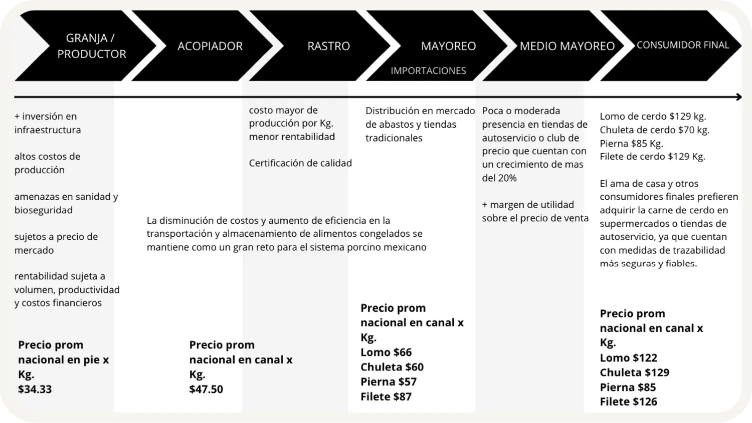 La cadena de valor de nuestra industria está compuesta por dos eslabones principales: La producción primaria y el procesamiento industrial. Esta cadena se caracteriza por la dispersión geográfica, la diversidad de perfiles empresariales en la etapa productiva y distintos agentes que intervienen en su comercialización. En el primer nivel de nuestra cadena estamos los productores. Este nivel enfrenta grandes y particulares desafíos. Requiere de una mayor inversión en infraestructura, modernización de sus procesos, mano de obra especializada. Se enfrenta a altos costos de producción, a amenazas en sanidad y bioseguridad, están sujetos a los precios de mercado y por ende su rentabilidad la condiciona el volumen, su productividad lograda y el costo financiero de la inversión en sus activos. Al término de esta trabajo, al día 17 de junio del 2024, el precio del cerdo en pie en promedio nacional oscilaba en los $38.94 y aunque se ve un alza, la variación realmente se traslada a centavos impactando de forma positiva más mínima a los desafíos mencionados. No hablemos de la variación del precio que existe entre los distintos estados productores, donde Sonora y Jalisco, a pesar de mantenerse en volúmenes altos de producción pugnan con los precios más bajos del país dónde el consumo per cápita llega a los 5 Kg/hab al año mientras en Yucatán y otros centros de consumo como lo es el centro del país llegan a los 22 kilos. En este nivel de la cadena que abarca la producción primaria el modelo de negocio de la porcicultura se encuentra en tiempos disruptivos. La tecnificación de los sistemas de producción ha traído cambios del mundo globalizado a un mayor ritmo del que el productor promedio puede mantener. La curva de innovación en nuestra actividad llego para muchos, antes de lo esperado y los Sitios I, II y III tendrán que estar a la altura de la nueva tecnología. No cruzar la brecha de la innovación será augurio de quedarse fuera dejando la producción del cerdo en manos de solo unos cuantos. Subirse a los nuevos modelos de producción no se limita a tomar una decisión, se requieren esfuerzos económicos gigantes que pocos pueden solventar teniendo márgenes de centavos o pesos por kilo que propone el mercado con sus niveles de importación. En un segundo escalón de nuestra cadena, mientras nos movemos en dirección del procesamiento industrial, se encuentran acopiadores y rastros que operan en el intento de disminuir los costos y aumentar la eficiencia en la transportación y almacenamiento de alimentos frescos y congelados y es un gran reto para el sistema porcino mexicano. Se topan con mayores costos de producción por kilo derivado de los altos costos energéticos, mano de obra, certificaciones de calidad y la competitividad de la distribución en los mercados de abasto. Aun así, la teoría nos habla que entre más cerca nos encontramos del fin de la cadena, a mayores márgenes podemos aspirar. Al mismo día de cierre, 17 de junio del 2024, el promedio nacional en canal llega a los $53.00 pesos por kilo según el SNIIIM (Sistema Nacional de Información e Integración de Mercados). El consumidor final siempre debe de verse como el último eslabón y mientras el precio de algunos cortes como el lomo en $129, la chuleta en $78, la pierna en $85, el filete en $129 pueden considerarse competitivos en comparación a otras proteínas, la realidad es que nuestra cadena opera con amplios márgenes entre el precio de venta de un eslabón a otro y los productores mexicanos sufren una baja representación de lo que son y el producto que ofrecen en la perspectiva del consumidor final. El ama de casa, el jefe de hogar y otros consumidores finales, van creciendo en la tendencia de adquirir la carne de cerdo en supermercados o tiendas de autoservicio, clubs de precio, ya que cuentan con medidas de trazabilidad, más seguras y fiables desde perspectiva. Son estos centros de consumo los que gozan el mayor margen de utilidad sobre el precio de venta que llega a ser del 30%. Sin embargo, el producto final llega en su mayoría a estos establecimientos de compra sin marca, sin identidad, sin información, a competir por atributos genéricos contra otra proteínas que no son una fiel representación de los esfuerzos de los productores ni de las bondades nutricionales de la proteína del cerdo. Rara vez el consumidor elegirá el filete de cerdo como opción para su familia por sus bondades nutricionales, rendimiento y precio sobre otras opciones, a menos que al igual que tú y yo, seamos parte activa de esta cadena de valor.