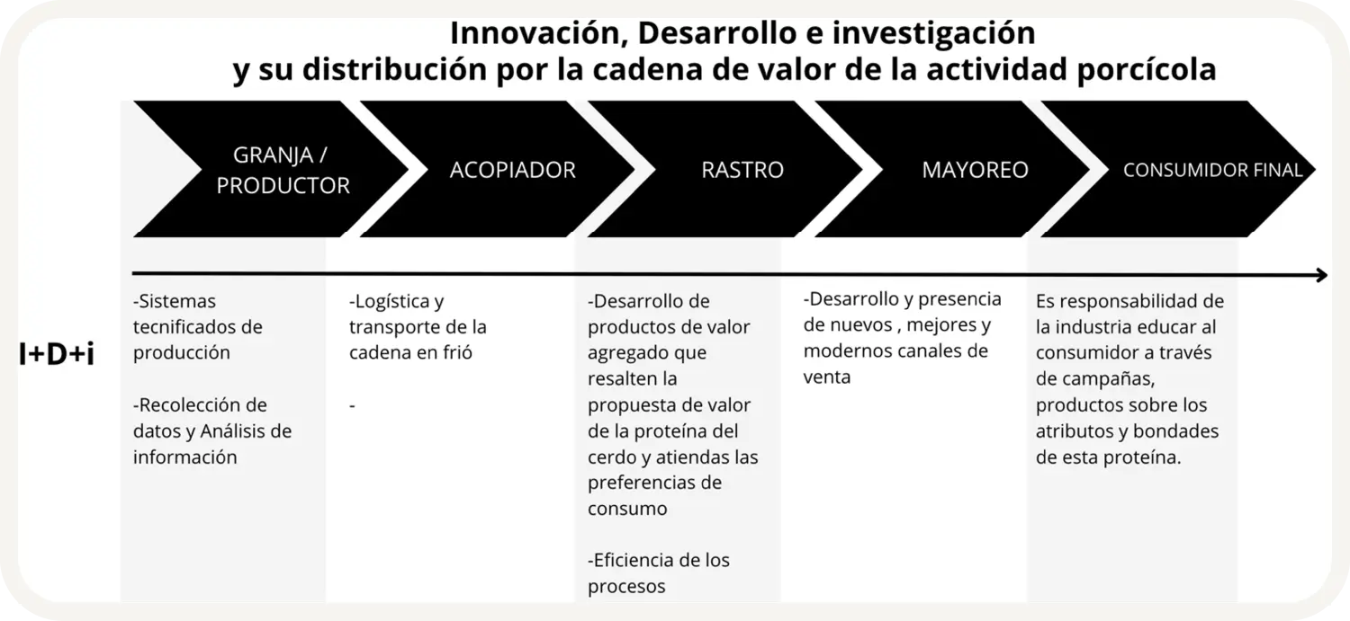 Aunque diferentes actores con diferentes modelos económicos seamos parte de la cadena de valor, como industria, el entendimiento de la teoría de la innovación debe verse como un esfuerzo en común. La distribución de la innovación a lo largo de la cadena no puede verse de forma aislada puesto que funcionamos como eslabones y el adoptar esta perspectiva donde cada uno de nosotros, desde nuestros encargados de maternidad, de engordas, técnicos, supervisores, médicos veterinarios zootecnistas, personal administrativo de las empresas que conformamos la industria, rastros privados y municipales, minoristas, comerciantes, directores, organismos que nos representan, debemos mantener un frente en común nos permitirá llegar a la meta donde México se posicione como un actor principal y proactivo en términos de producción y consumo, de exportación para dejar atrás los tiempos donde nos vemos condicionados a la situación del mercado.