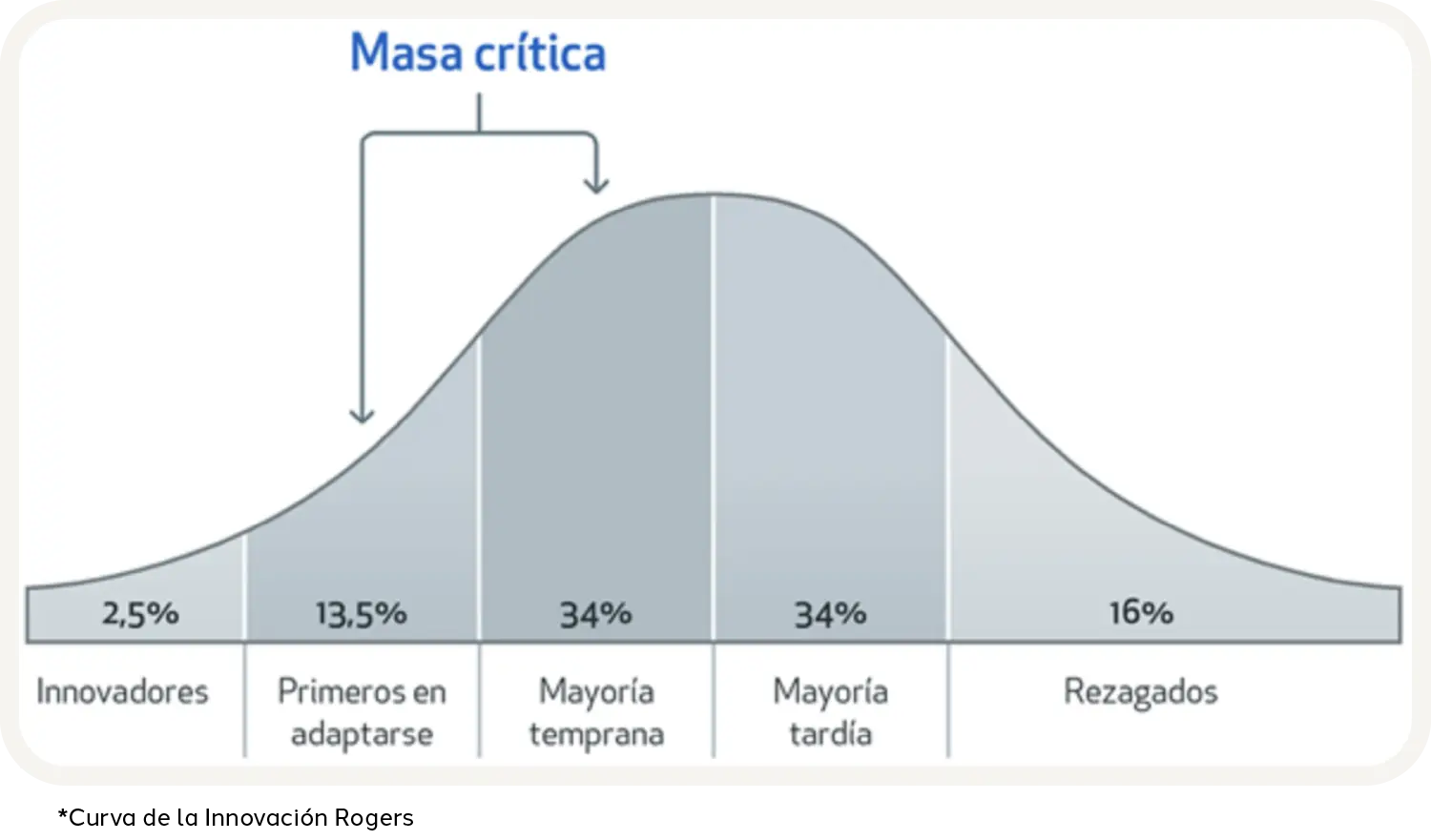 La innovación también es un proceso. Uno que debemos adoptar como filosofía empresarial y como gremio. Debemos aprender a gestionar la innovación para hacerla llegar al consumidor. En la curva de la innovación, al aplicarla al mercado, distinguimos 5 tipos de personajes: los innovadores que son las personas que generan las nuevas ideas creativas, los primeros adoptantes, que son los que cuentan con la predisposición a probar nuevas ideas, modelos o sistemas, la mayoría temprana, aquellos que adoptan los nuevos cambios, la mayoría tardía, que escépticos al cambio van asumiendo poco a poco la innovación para no caer en la obsolescencia y por último se encuentran los rezagados, quienes se oponen ante cualquier cambio radical hasta que no encuentran otra forma de seguir adelante. Cada personaje en esta curva de innovación tiene sus desafíos. Los innovadores generan ideas, pero carecen de los recursos para implementarlos. Los primeros adoptantes invierten en llevar las ideas a un modelo de negocio, pero su entrada en la participación de mercado puede verse comprometida por actores de la mayoría temprana, que generalmente son empresas consolidadas, con amplios recursos, líderes de mercado, capaces de presentar la innovación y penetrarse de manera más rápida en el mercado gracias a sus canales de venta. La mayoría tardía serán empresas que se suman a la innovación intentando replicar los productos demandados y atenidos a compartir lo que resta del mercado. En cuanto a los rezagados serán actores de la industria que poco a poco quedarán en su mayoría fuera de ella.