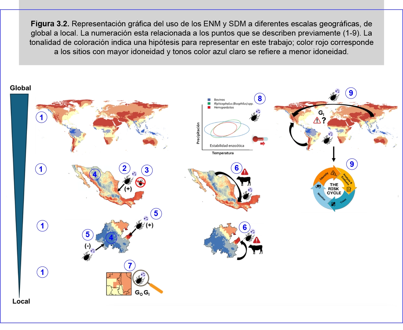 9. Predicción de la invasión (GO), establecimiento y expansión geográfica de especies de garrapatas exóticas, basado en la metodología “El ciclo de riesgo de amenazas” (del inglés hard risk cycle) que incluye las etapas de identificación, evaluación, mitigación, preparación, respuesta y recuperación, el cual es un marco ampliamente utilizado para gestionar los riesgos epidemiológicos.
