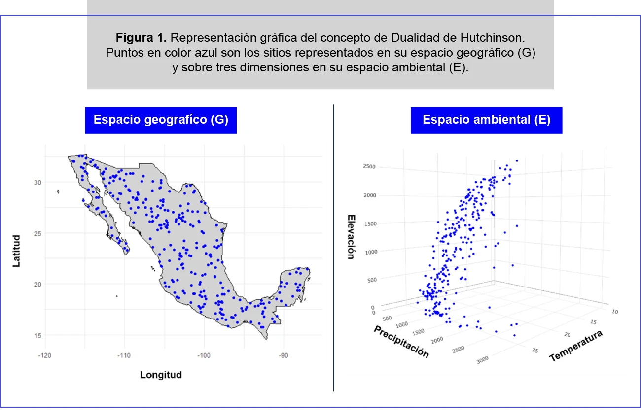 Para poder mapear las condiciones del nicho ecológico de las especies en la geografía, es preciso hacer uso de la relación que hay entre el espacio de variables ambientales y el espacio geográfico, a lo que se conoce como la dualidad de Hutchinson (Coldwell y Rangel, 2019) (Figura 1). Este concepto hace referencia a que la localización de un sitio especifico en la geografía tiene una posición dentro de un ambiente (E) y, por otro lado, un sitio especifico dentro de un ambiente puede reflejarse en varias posiciones en la geografía (G). De tal manera que la presencia de una especie en sitios geográficos lejanos, pueden tener una cercanía ambiental, o bien, sitios geográficamente cercanos tener una lejanía ambiental.
