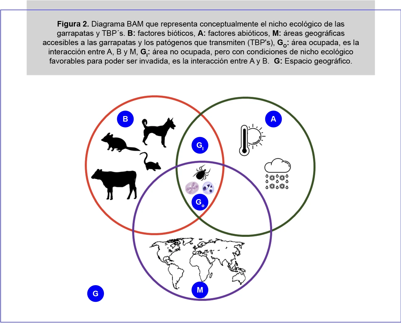 Las garrapatas son parásitos poiquilotermos, lo que implica que sus procesos metabólicos, tasas de crecimiento, periodos de incubación y el desarrollo de los patógenos que transmiten dependen directamente de las características ambientales (Randolph, 2004). Bajo este escenario, el nicho ecológico de las garrapatas y los patógenos que transmiten (TBP´s por sus siglas en inglés) está conformado por factores abióticos (condiciones climáticas) y bióticos (hospederos, vegetación, etc.), que se encuentran presentes en las áreas donde se distribuyen (Pfäffle et al., 2013) (Figura 2).