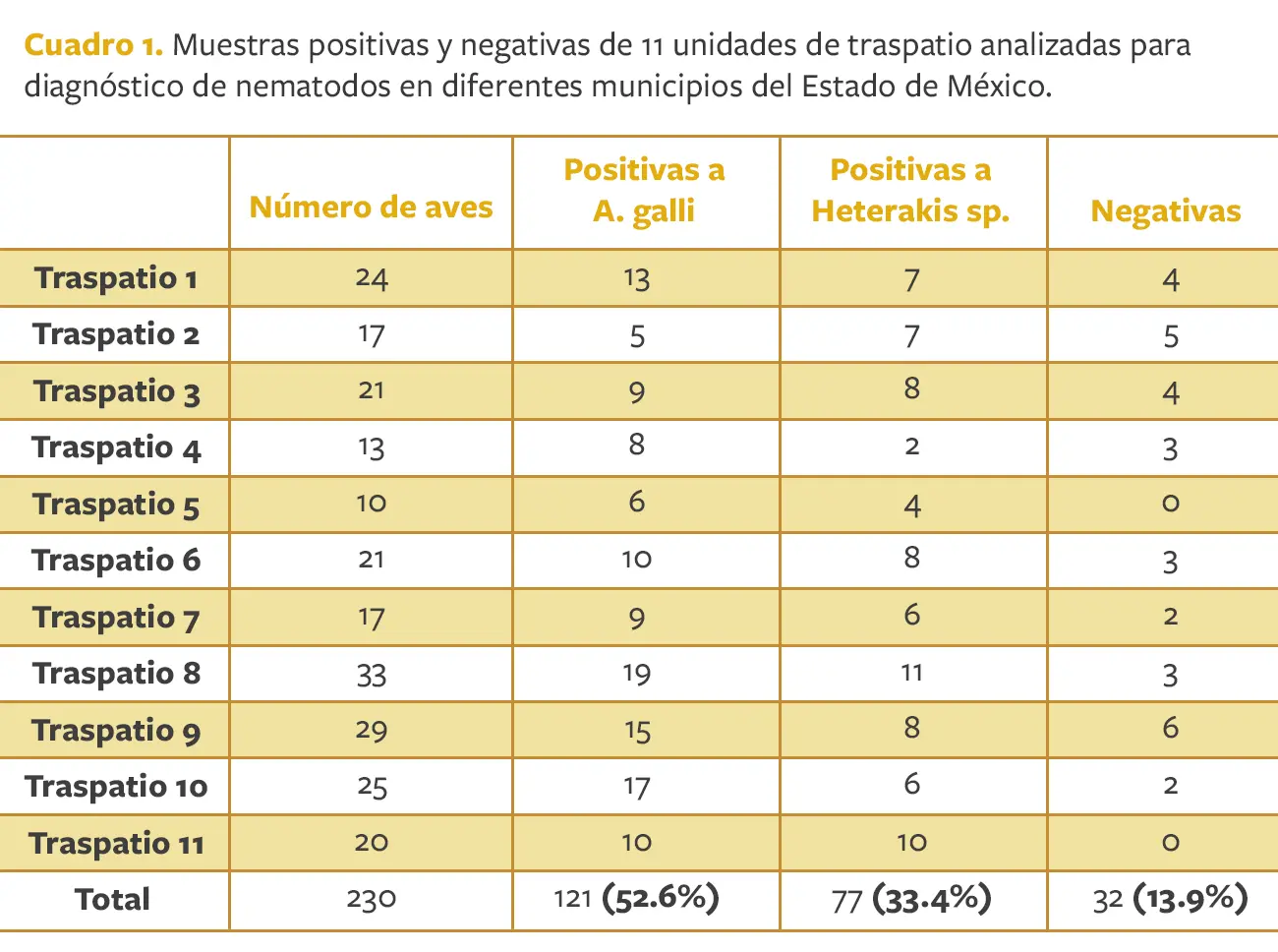 Al concluir el estudio se puede determinar que se encontró una frecuencia positiva parasitaria de 86% en las unidades de traspatio al oriente del Estado de México. Se encontraron 2 tipos de parásitos: Ascaridia galli (52.6%) y Heterakis sp. (33.4%) siendo una parasitosis mixta en la mayoría de las muestras. Las hembras tienen el mayor porcentaje de infestación (92.17%) que los machos (7.82%).
