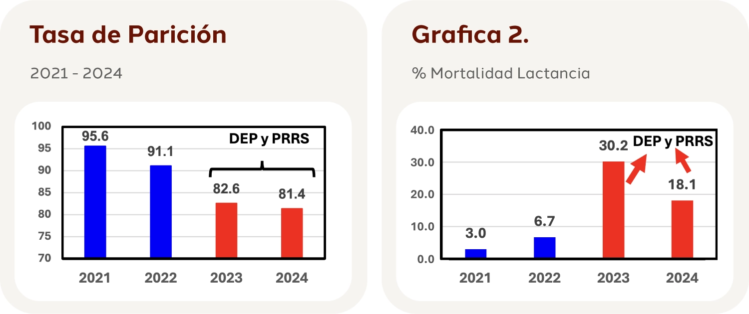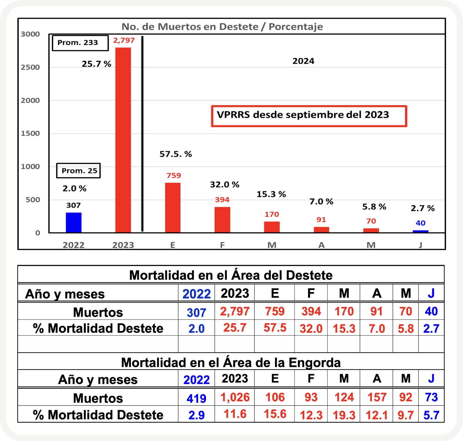 Una granja de ciclo completo de 900 hembras, ubicada al poniente del estado de Jalisco, se infectó por el VPRRS en septiembre del año 2023 presentando un aumento en el número de hembras repetidoras de estro, reduciendo la tasa de parición al 80% (87% 2022), y en el área del destete un incremento en la mortalidad, entre las semanas 7 y 10 de edad llegando hasta un 57%, principalmente por neumonías con complicaciones por agentes etiológicos secundarios de origen bacteriano y viral, afectando gravemente la rentabilidad. Teníamos que detener la mortalidad ya que se tomaría la decisión de cerrar la granja. En el municipio donde se encuentra la granja se cuenta con una población aproximada de 10,000 cerdos los cuales todos se infectaron ya que en la asociación local de porcicultores así lo comentaron. La granja en donde se desarrolló este trabajo cuenta con el 90% de la población porcina del municipio y que durante 33 años permaneció negativa de la enfermedad por el VPRRS. El diagnóstico presuntivo y definitivo fueron fundamentales para generar la estrategia correctiva, implementando el uso de una vacuna nueva en el mercado, activa naturalmente apatógena de VPRRS basada en la cepa G16X.