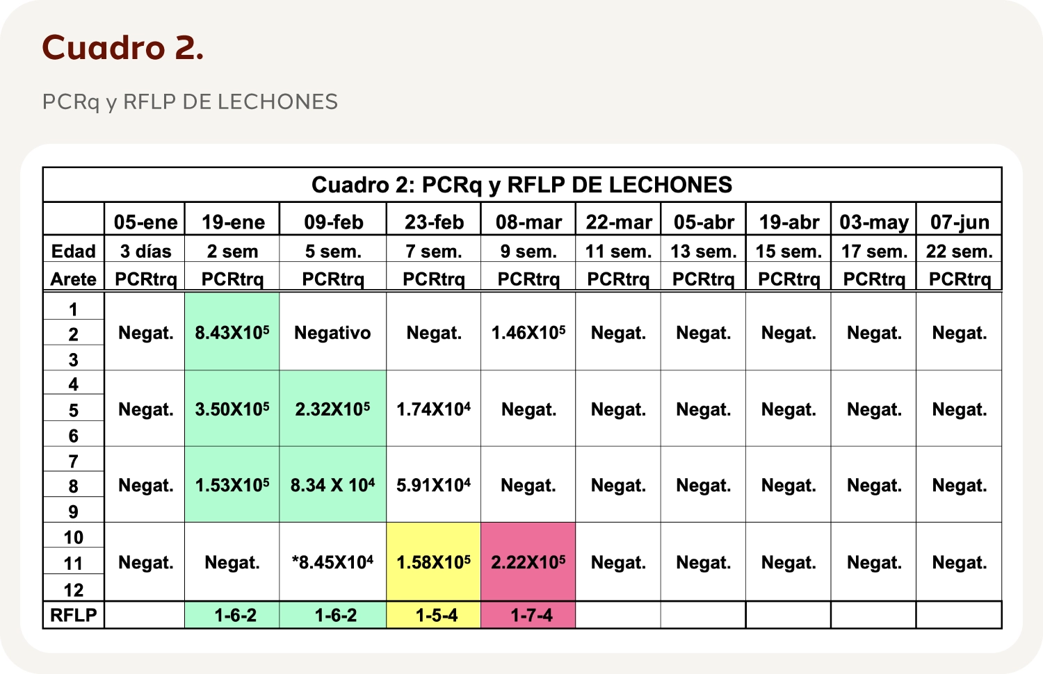 En el cuadro 2, a la semana 2 y 5 de edad post vacunación se ven los resultados de la prueba de PCRq contra VPRRS detectando la presencia del virus de la vacuna mediante la secuenciación del ORF 5 y calculando el RFLP 1-6-2 (in silico).