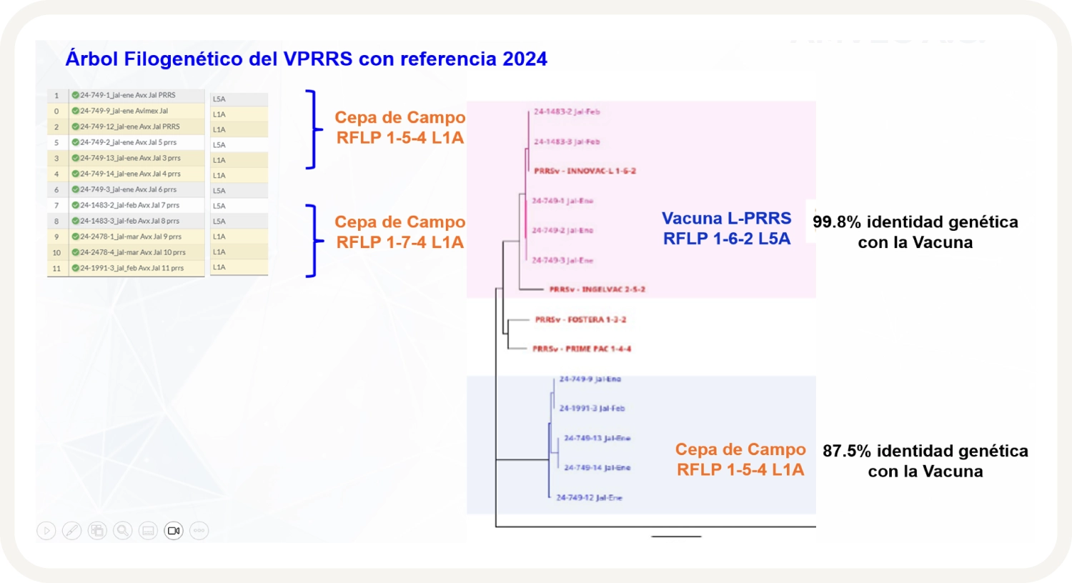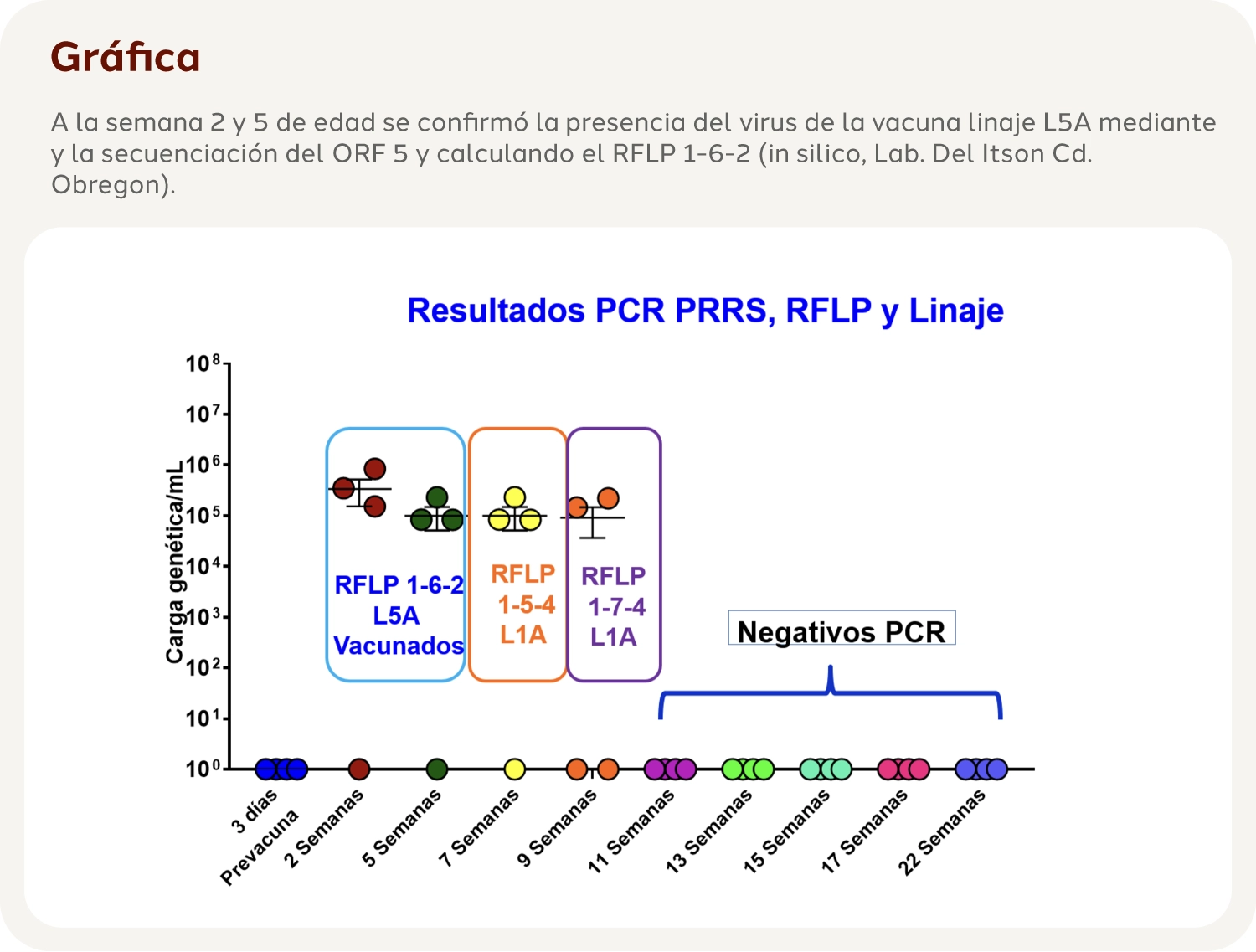 Granja de 900 hembras y su progenie. Previo al inicio de la evaluación se realizaron pruebas diagnósticas para VPRRS en hembras y lechones, incluyendo el diagnóstico (Dx) clínico, a la necropsia y de laboratorio, (histopatológico, ELISA IDEXX y PCRq, mediante pools de sueros y logrando confirmar la presencia del VPRRS. El Dx definitivo fue fundamental para generar la estrategia correctiva, con un programa de vacunación soportado con la vacuna activa naturalmente apatogena del VPRRS, cepa G16X, nueva en el mercado. El 5 de enero del 2024 se vacunó al primer lote de lechones del 3er a 5º día de edad por vía intranasal (IN 2 mL) y el 9 y 10 de enero del mismo año se a todo el pie de cría en sábana IM 2mL, el cual se revacunará cada 4 meses. Se identificaron 15 hembras y 12 lechones con arete y se les realizó un seguimiento longitudinal cada 2 semanas en lechones y cada 4 semanas en hembras mediante las pruebas de ELISA, PCRq contra el VPRRS, y a muestras positivas pruebas de secuenciación del ORF 5 y cálculo del RFLP in silico.