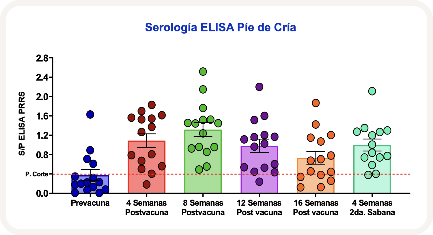 La ELISA de PRRS de las hembras muestran una positividad del 93% después de la segunda aplicación en sabana y un aumento en los valores S/P, indicativo de una respuesta efectiva a la vacunación y no se detectó el virus de campo por PRCq en ningún muestreo en las hembras.