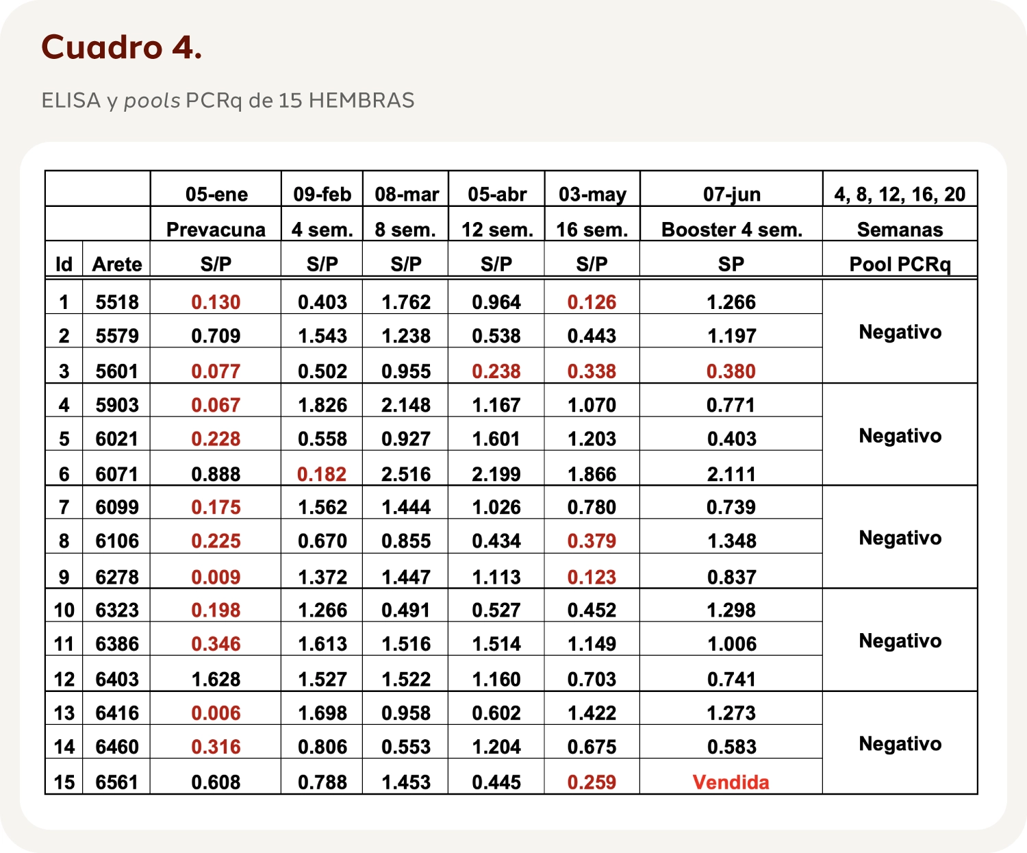 En el Cuadro 4, el pie de cría, a las 8 semanas post vacunación el 100% seroconvirtio contra el VPRRS y a las 12 semanas se registró un 94% de seropositividad. Todos Los PCRq contra el VPRRS resultaron negativos en el pie de cría.