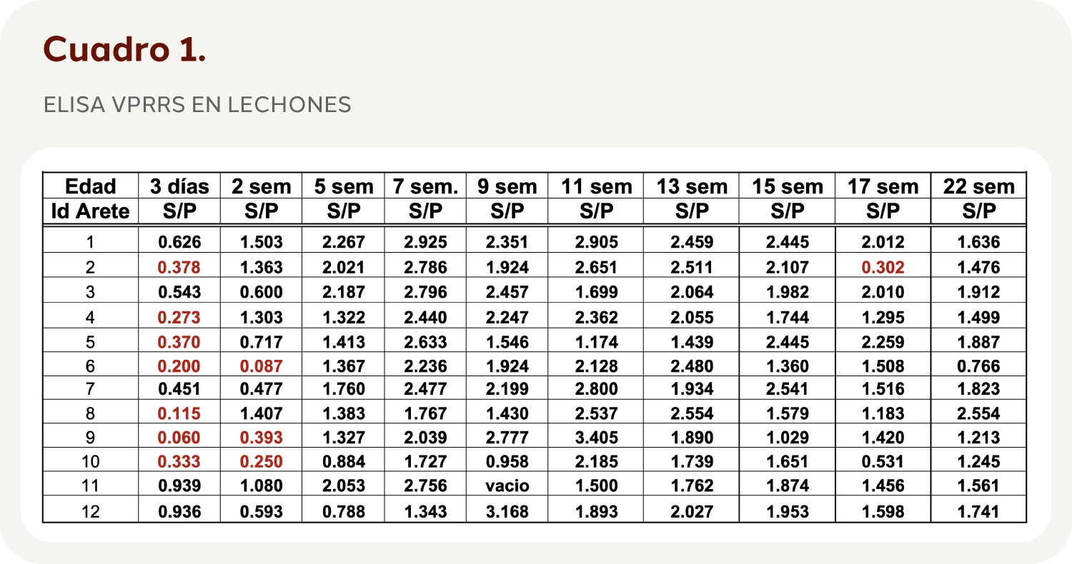 En el cuadro 1, a los 3 días de edad 7 de los 12 lechones aretados fueron negativos con la prueba de ELISA contra VPRRS y 5 lechones resultaron positivos debido a la inmunidad pasiva vía calostro y a la semana 2 y 5 de edad se evidenció que los cerdos vacunados desarrollaron una respuesta inmune post aplicación de la vacuna.