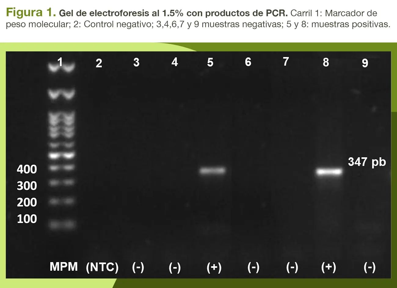 En la detección por PCR, el 20% de las vacas abortadas resultaron positivas a T. foetus (TRICH+) usando PCR convencional (Figura1), observando un bandeo especifico de la región del ADN ribosomal de T. foetus con un tamaño de 347 pb.