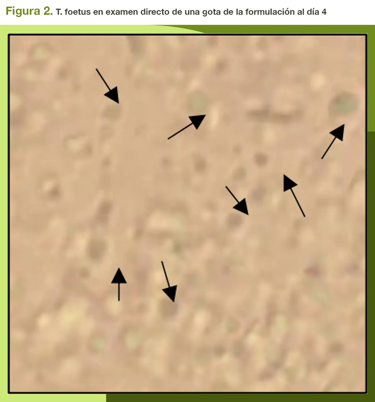 Otro factor importante en estudio fue la estabilidad al posterior descongelamiento de las muestras conservadas a 60°C y formular un medio de cultivo alternativo para poder demostrar la viabilidad de T. foetus sin criopreservadores. La motilidad se evaluó en frotis directos obtenidos de la formulación desarrollada y de los medios de cultivo, al observar al microscopio en 100x, al día 4 de las dos muestras de piometra detectadas por PCR. Se observaron pequeños microorganismos con forma ovoide y un pequeño flagelo que se movían de manera espasmódica, característicos de Trichoma foetus (Figura 2). Archelli (2023) describe que, en el campo de observación de las tricomonas, se observan microorganismos con movimientos espasmódicos, con traslación o sin ella, viéndose el flamear la membrana ondulante y los flagelos anteriores. Lo anteriormente descrito coincide con los resultados obtenidos a la observación directa de las siembras positivas, cuyos movimientos eran espasmódicos y ondulantes al día 4.