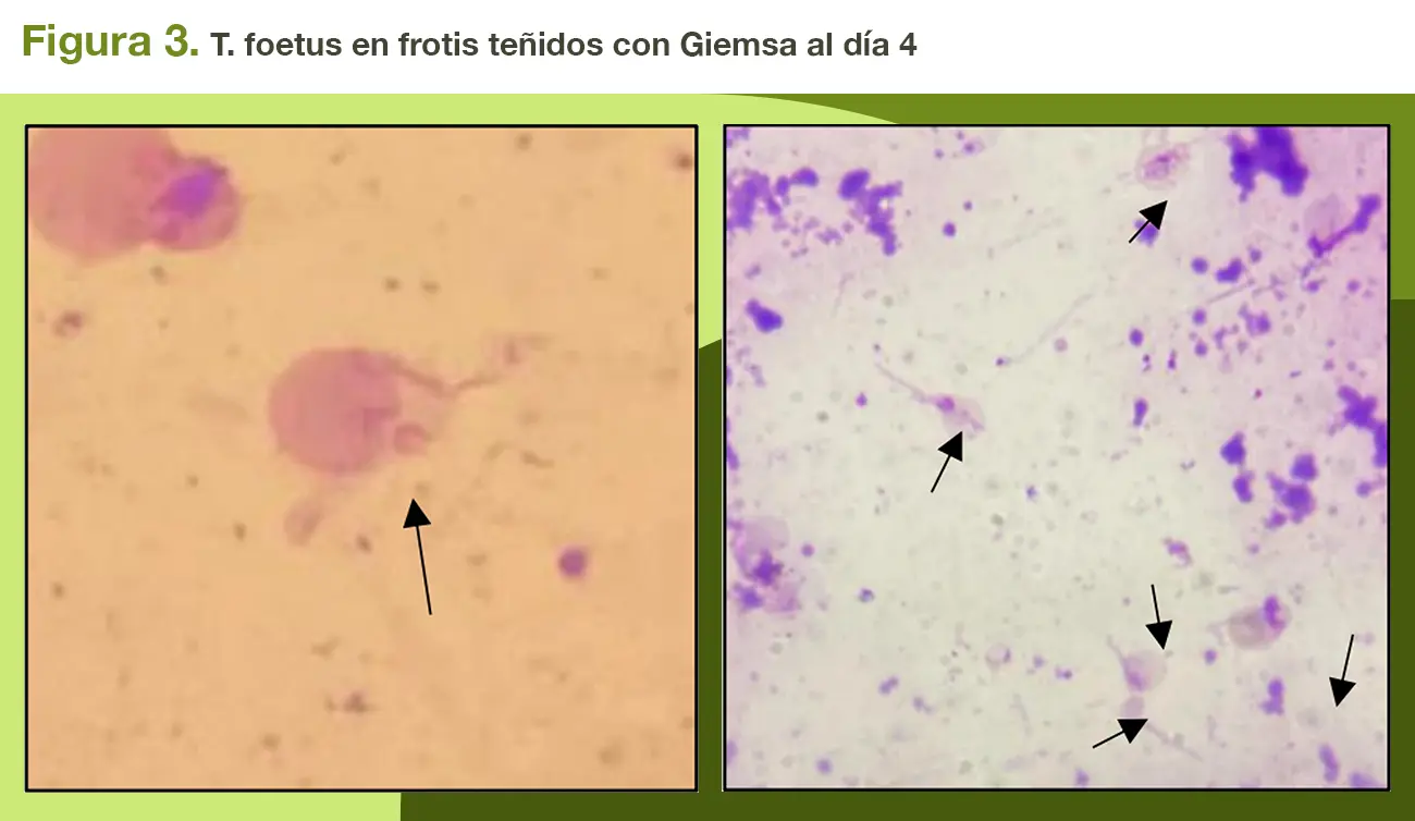 Con las tinciones de Gemsa se corroboro el desarrollo de T. foetus, notándose una estructura ovoide rosado, con núcleo morado y el característico axostilo. En cuanto al desarrollo de la membrana ondulante y flagelo posterior, solo se alcanzó a observar en pocas trichomonas (Figura 3). Unzaga y Zonta (2023) comentan que las muestras que se incuban a 37ºC y se observan cada 24 horas para detectar el desarrollo del agente, generalmente ocurre entre el día 2 y 4 de incubación. En el presente ensayo, se observó mayor cantidad de trichomonas al día 4, coincidiendo en el rango descrito por el autor.