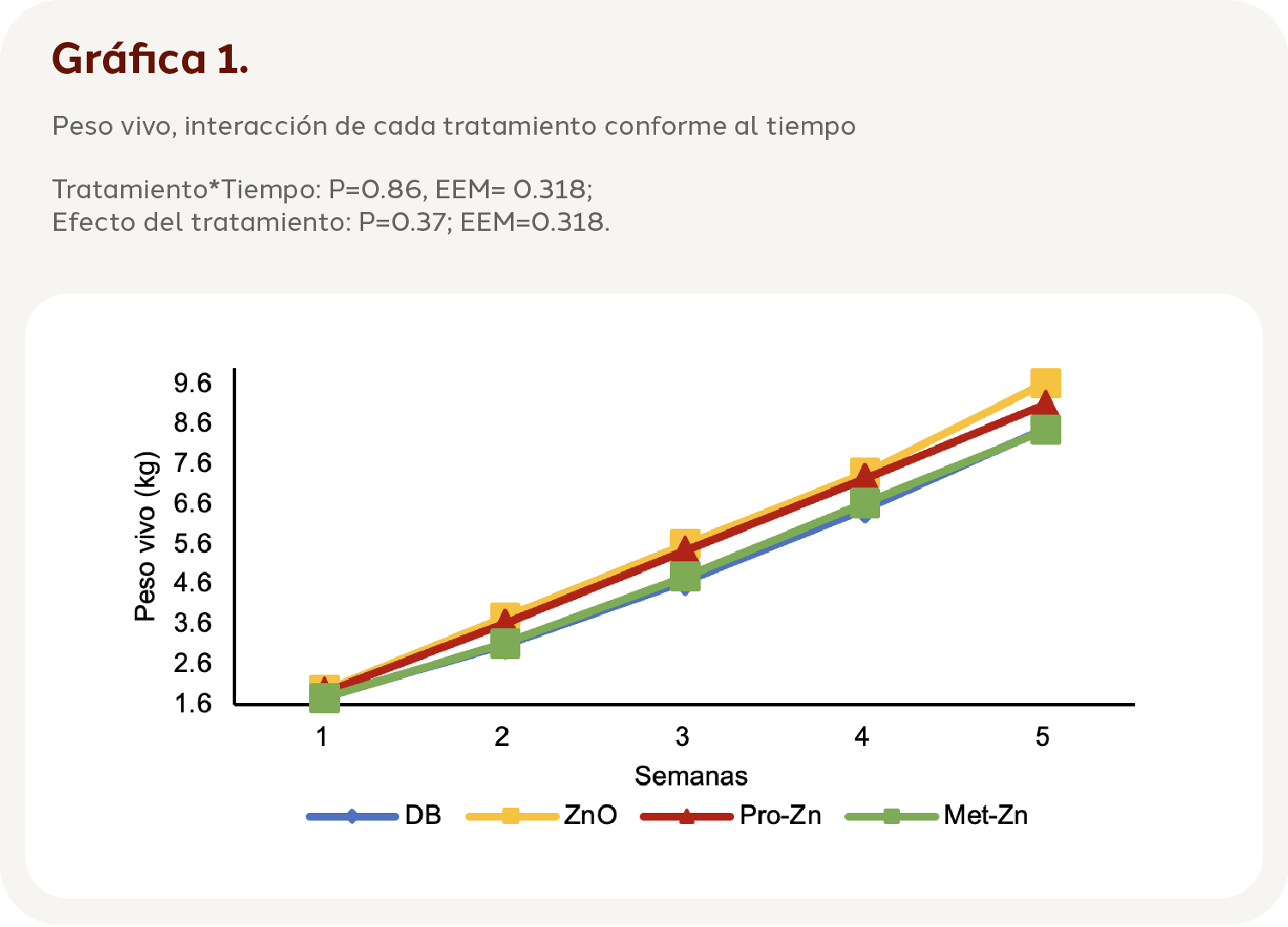 El presente estudio mostró que el PV de lechones lactantes no se ve afectado por el uso de 80 ppm Zn, a través de ZnO, Met-Zn y Pro-Zn. Hudson et al. (2004), indicaron que no existe un impacto en el peso corporal cuando se suministran dosis por arriba de los 40 mg kg-1 en aves, sin embargo, en lechones no existe evidencia de efecto por niveles de Zn similares a los utilizados en este estudio. Es importante mencionar que aun cuando no hubo diferencias entre tratamientos, se observó que el tratamiento T2 fue el que obtuvo los pesos más altos a lo largo del experimento, alcanzando un peso promedio de 9.62 kg, lo que coincide con Stensland et al. (2015), quienes al comparar ZnO con un cinamaldehído adicionado con un complejo permeabilizante observaron que el ZnO generó el PV más alto con 13.6 kg a una edad de 35 días y 18.2 kg a los 42 días de vida, este comportamiento podría deberse a que esta fuente inorgánica es considerada la principal para mejorar el rendimiento del crecimiento (Hill et al., 2000); en caso contrario, los lechones alimentados con el tratamiento T4 mostraron que su PV siempre fue el más bajo comparado con los demás tratamientos, lo que coincide con Yan et al. (2017), quienes alimentaron a conejos con zinc orgánico e inorgánico y de los pesos más bajos destacaron los conejos que estaban alimentados con 80 mg kg-1 de Met-Zn.