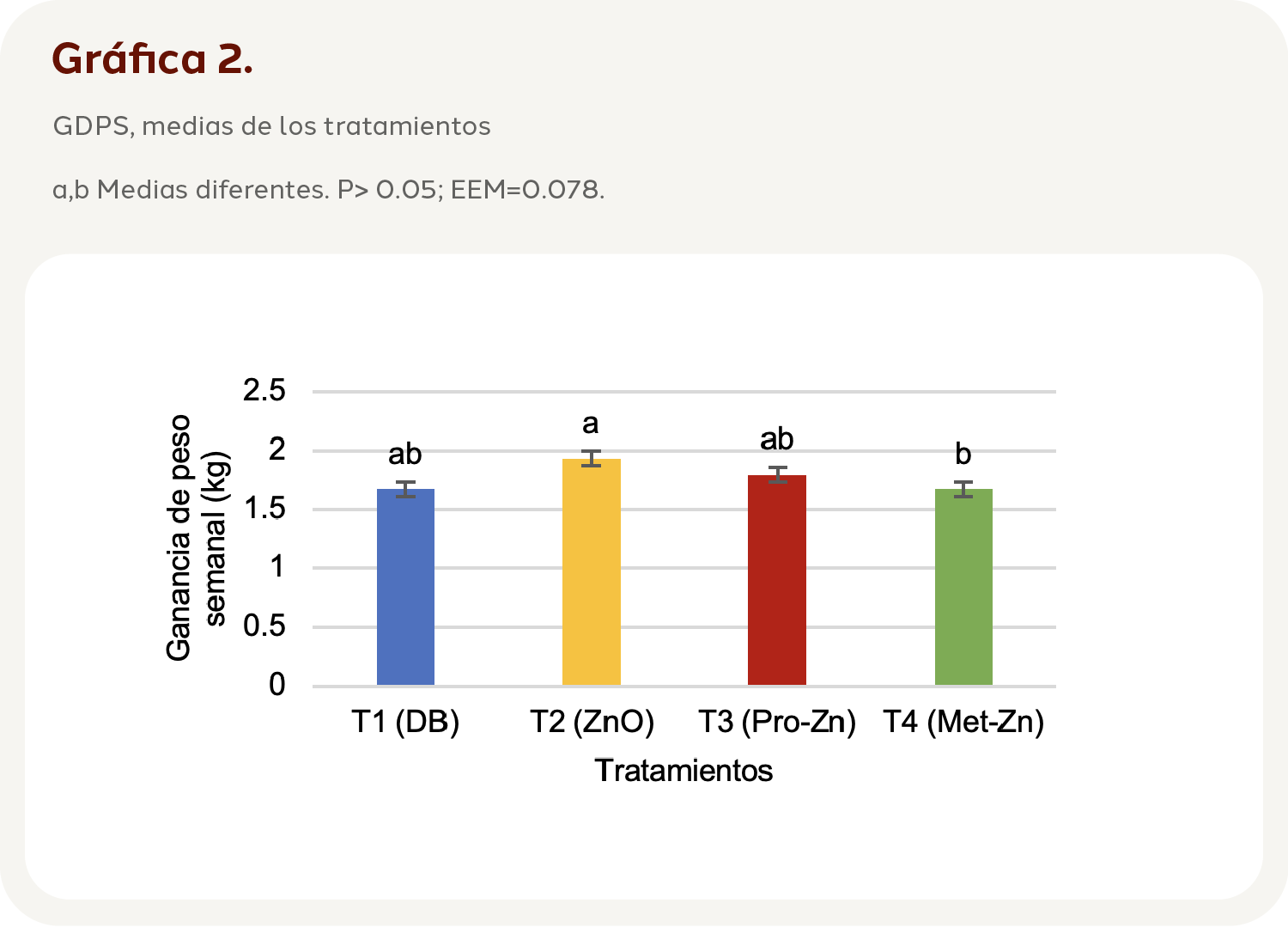 La GDPS mostró diferencias (P=0.05, EEM=0.078) entre los tratamientos T2 y T4. Aunque en el caso de los tratamientos T1 (1.67 Kg) y T3 (1.79 Kg), no existió diferencia (P=0.39; EEM= 0.19) (Gráfica 2).