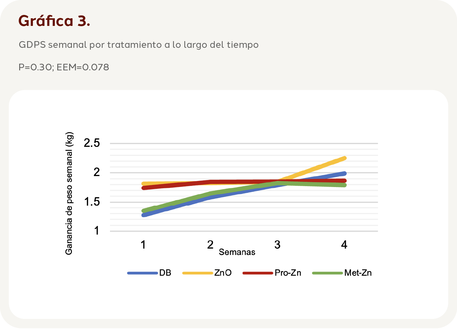 Al analizar el efecto de los tratamientos a lo largo del tiempo (Tratamiento*Tiempo), se encontró que el comportamiento no cambio en el tiempo (P=0.30). Aunque, en la semana tres se encontró que los tratamientos mostraron una GDPS similar (P=0.99) en los cuatro tratamientos, y a partir de ahí se observa como el tratamiento T2 generó una diferencia de 270 g con respecto al T1 y hasta 460 g con el T4 (Gráfica 3).