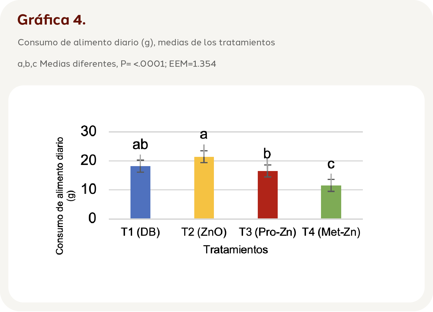 El tratamiento T3 produce un consumo de alimento bajo (16.537 g) y los lechones del tratamiento T4 fueron aún menores con 11.583 g, lo que coincide con Liu et al. (2020), quienes suplementaron distintas fuentes de Zn (ZnSO4, Zn-Gly, Zn-Met) a 100 mg kg-1 y éstas no influyeron en la ingesta diaria promedio de alimento, caso contrario con Wen-Bin et al. (2019), quienes al comparar Met-Zn a 80 mg kg-1 con una fuente inorgánica (ZnSO4) identificaron que se observa un mejor efecto en la GDPS promedio en lechones destetados.