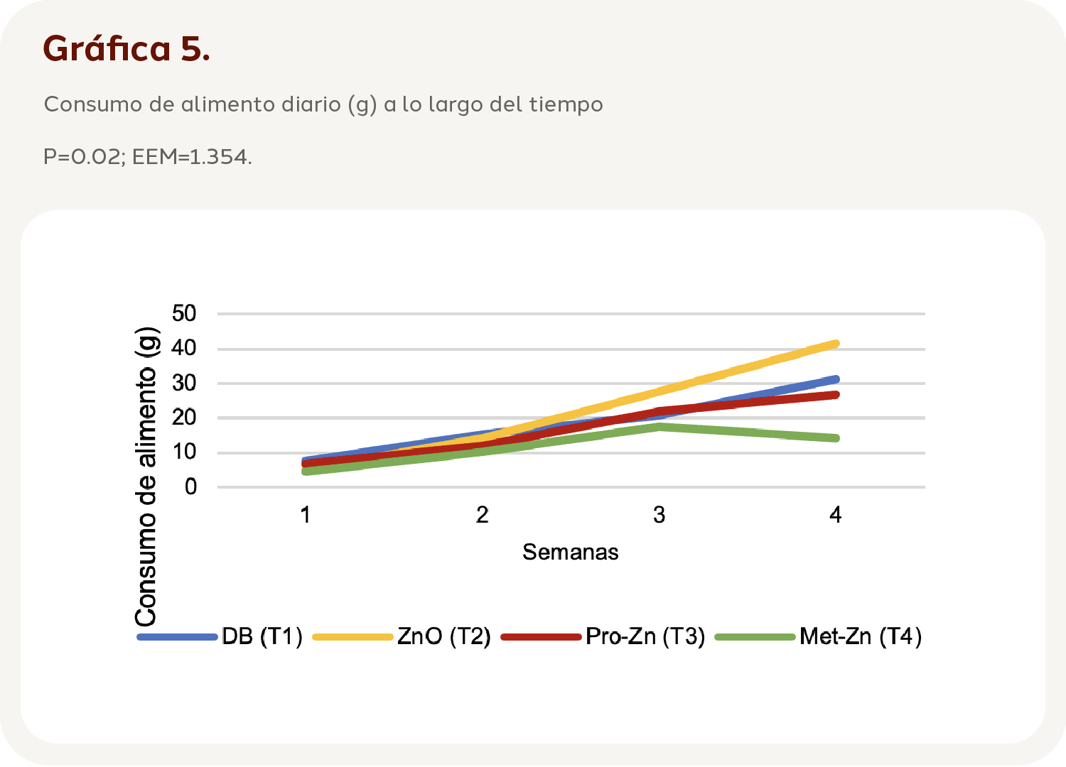 Al observar la interacción de los tratamientos a lo largo del tiempo (Tiempo*Tratamiento), se pudo identificar que fue significativa (P=0.02; EEM=1.354), el T2 fue el tratamiento que obtuvo el valor más alto al final del experimento (46.25 g), mientras que el T4 fue el que obtuvo el valor final más bajo (10.5 g) (Gráfica 5).