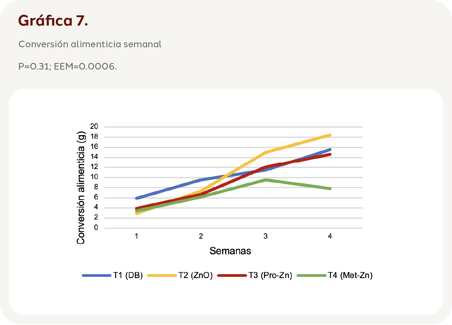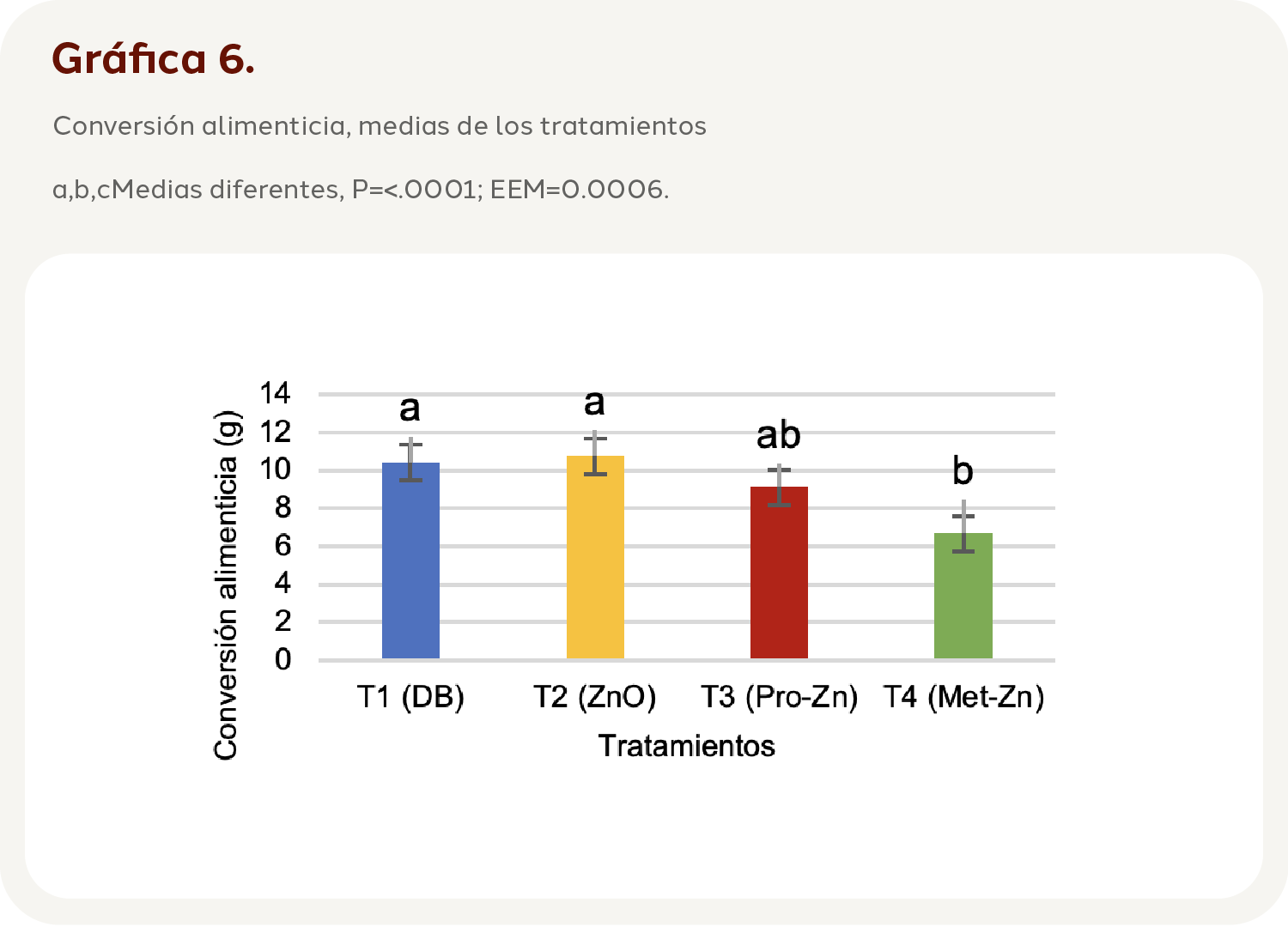 La conversión alimenticia mostró diferencias entre tratamientos (P=<.0001; EEM=0.0006). El T1 (10.42 g) fue igual que T2 (10.76 g) y T3 (9.12 g), mientras que T4 (6.68 g) fue menor y por tanto distinto a los demás tratamientos (Gráfica 6).