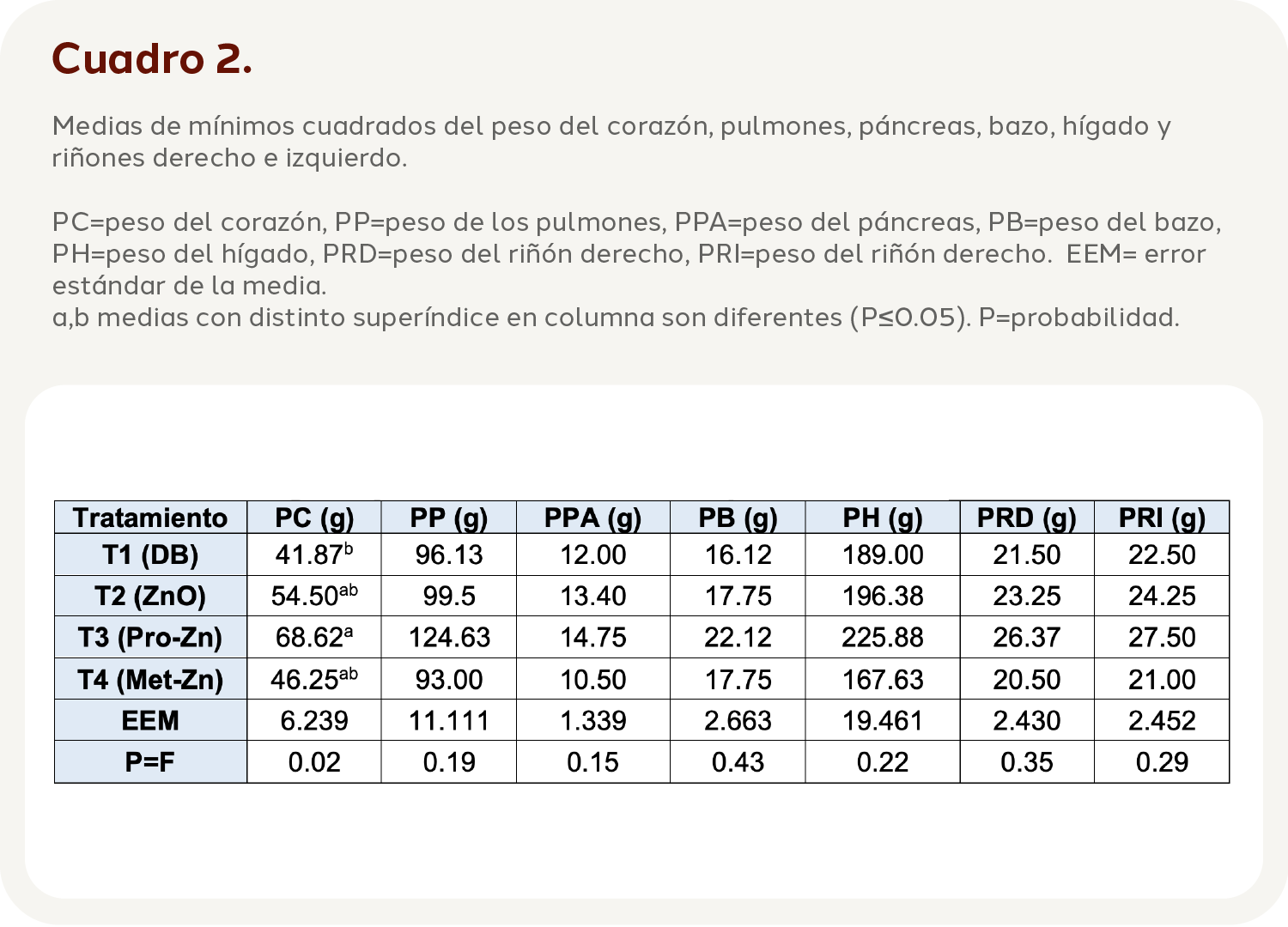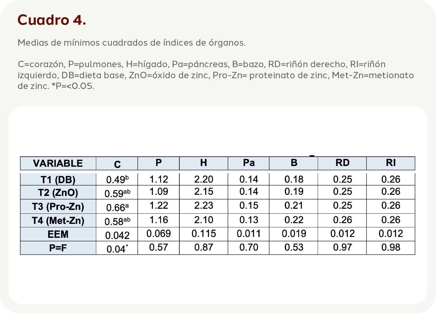 Páncreas: los resultados obtenidos de este experimento indican que el índice más alto lo obtuvo el tratamiento T3 con un valor de 0.15, los lechones utilizados en este estudio son considerados de alta eficiencia, por lo cual podría deberse que el peso del páncreas se relacione con la eficiencia del animal, un animal de alta eficiencia tendrá un páncreas de mayor masa en comparación con un animal que posea una baja eficiencia (Meyer et al., 2015). van Heugten et al. (2003), compararon ZnSO4, Lys-Zn y Met-Zn y los pesos más altos fueron obtenidos con 80 ppm de Met-Zn, lo que podría indicar que las fuentes orgánicas de Zn generan un mayor peso en comparación con las inorgánicas, lo que concuerda con este estudio, además coincide con Shinde et al. (2006), quienes alimentaron a cobayos con distintas fuentes de Zn y la que generó un mayor índice fue 20 ppm de ZAAC (ZnCl2+Met-Zn), con un valor de 0.39.