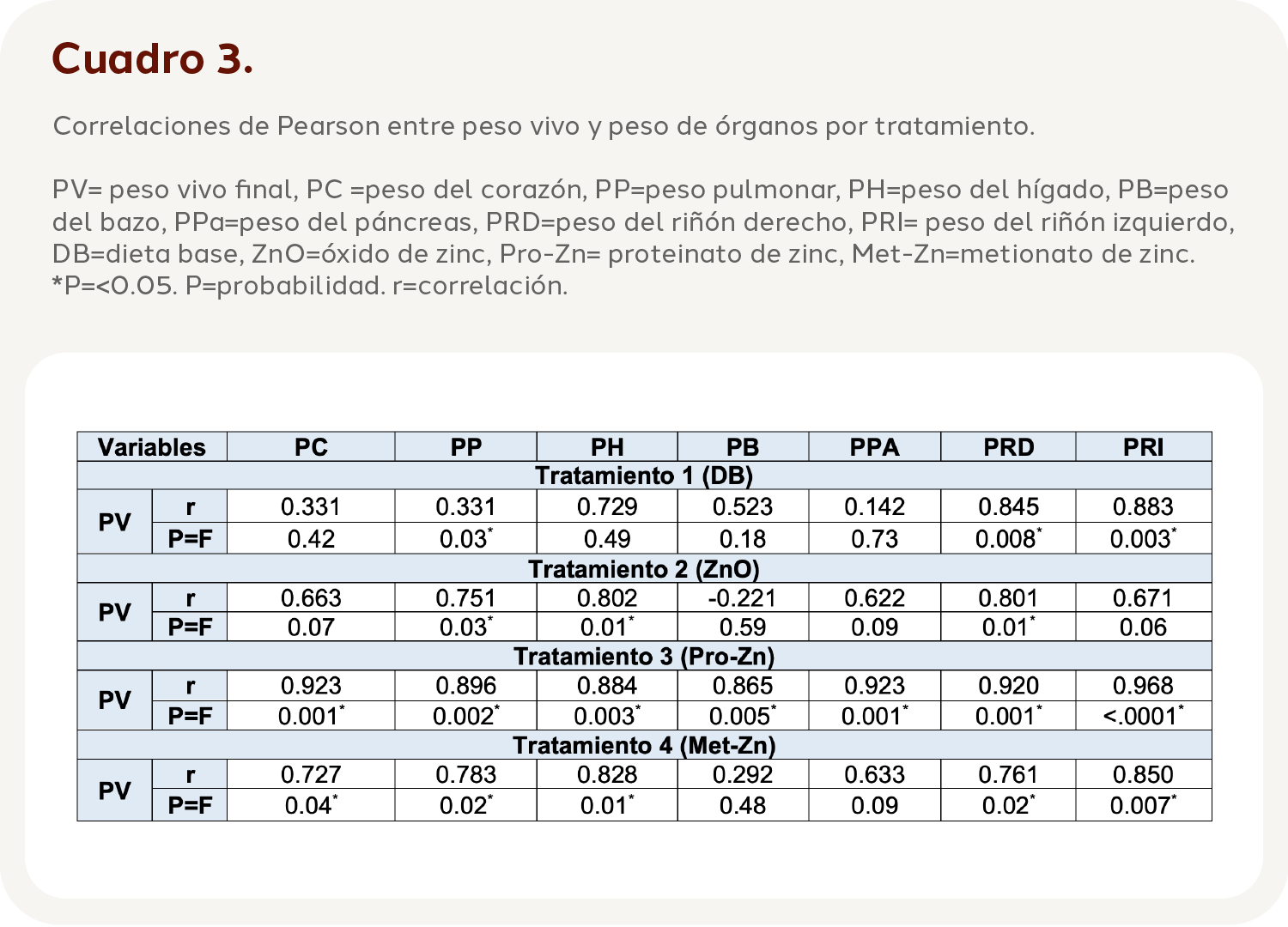 En el tratamiento T3 se puede detallar que existe una correlación significativa entre el PV con todos los pesos de los órganos evaluados, PC (P=0.001), PP (P=0.002), PH (P=0.003), PB (P=0.005), PPA (P=0.001) y PRD/PRI (P=0.001; P<0.0001). En el tratamiento T4 se puede resaltar que existe una correlación significativa entre el PV con el PC (P=0.04), PP (P=0.02), PH (P=0.01) y PRI (P=0.02; P=0.007) y PRD (P=0.02).