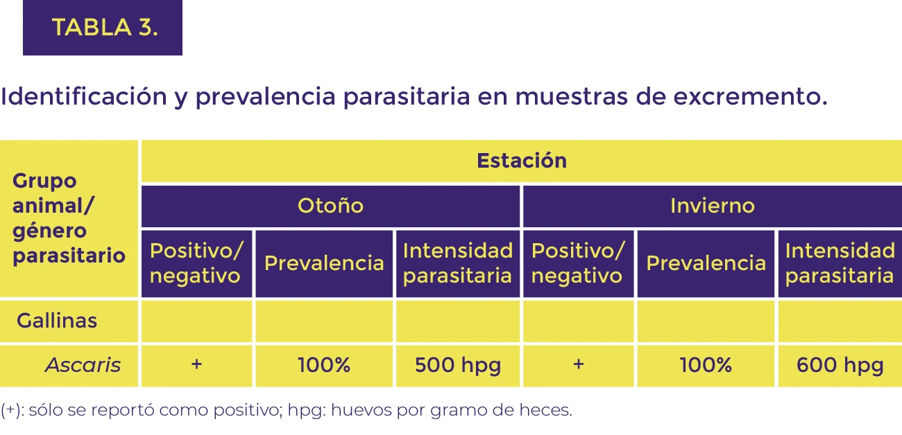 Con respecto a las muestras compuestas de excremento de las gallinas en el presente estudio, se identificó el género parasitario Ascaris con una prevalencia del 100%, este hallazgo se puede atribuir a que las gallinas algunas veces se fugan de su corral y frecuentan distintas áreas del RU-UACJ donde interactúan con otras especies de animales, por lo tanto, esto hace que las gallinas queden predispuestas a un contagio parasitario, además el piso del corral de las gallinas es en tierra y este elemento puede favorecer a una transmisión de patógenos en las gallinas, porque estas suelen escarbar y picotear el suelo constantemente en busca de lombrices donde de forma accidental pueden ingerir huevos de parásitos contenidos en el suelo. También se considera que la presencia de este parásito puede estar referido a la ausencia de un plan de control sanitario.