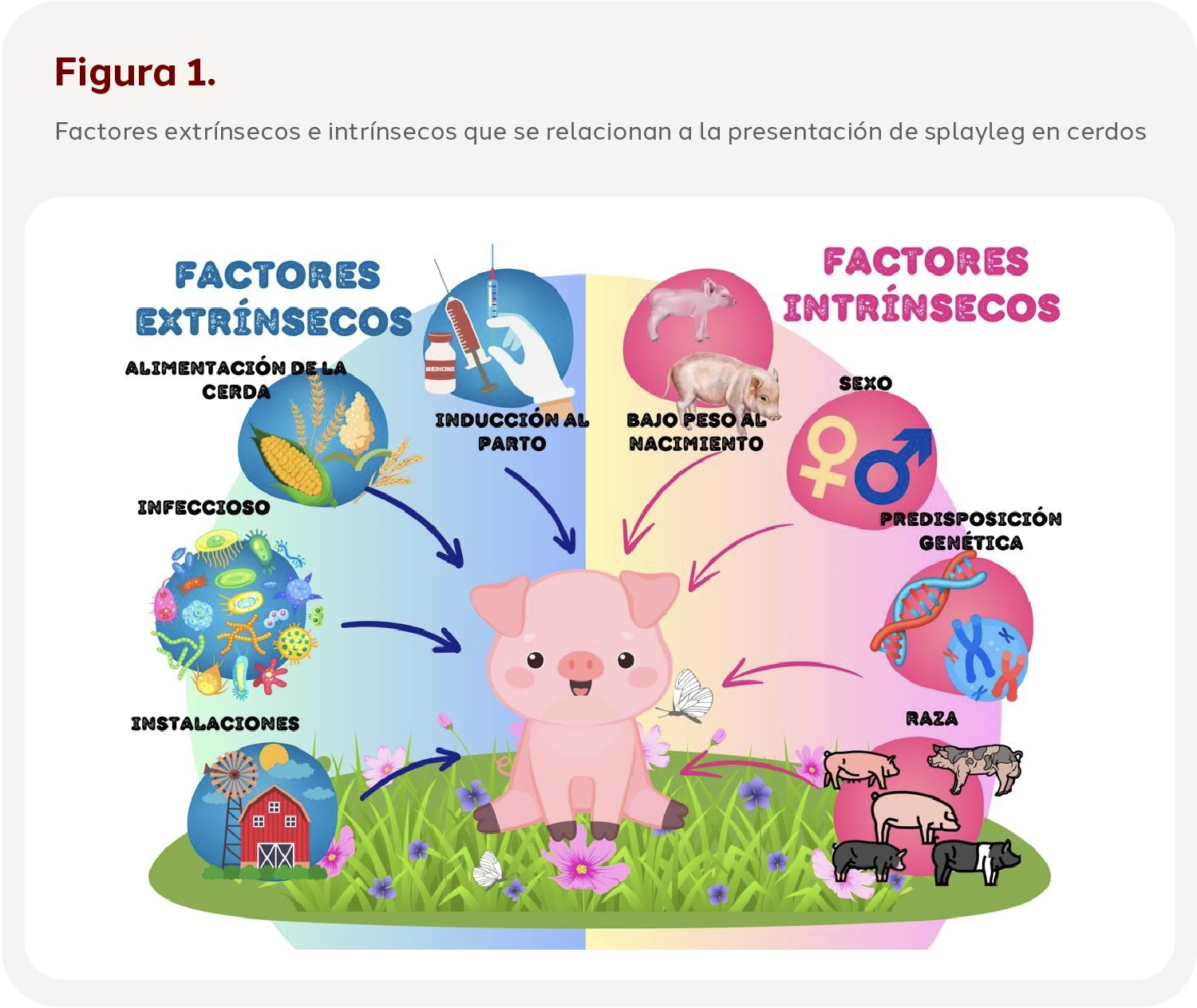 Cómo ya se mencionó, este síndrome es multifactorial, ya que se ha descrito que puede estar relacionado con varios factores, los cuales pueden ser clasificados en extrínsecos o intrínsecos (figura 1). La causa en sí de este síndrome se relaciona a una inmadurez del músculo esquelético con una disminución en el diámetro axonal y la vaina de mielina de la fibra muscular que inerva los músculos aductores de los miembros (Vassilis G. Papatsiros., 2012). En un estudio previo se describieron muestras histológicas del músculo semitendinoso de los lechones que presentaron splayleg. Los autores encontraron que estos lechones tenían una mayor proporción de fibras tipo II, lo cual nos indica que hay una inmadurez de las miofibrillas. Adicionalmente a esto, se observó un número menor de mionucleos por fibra y una mayor actividad apoptótica, así como una atrofia de las miofibras (Toni, S. et al., 2023).