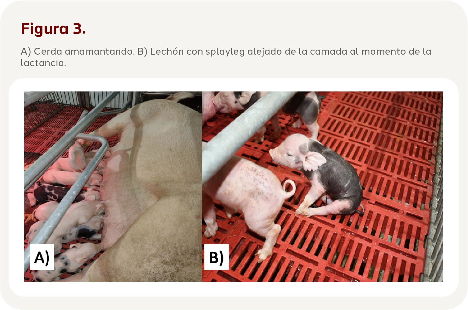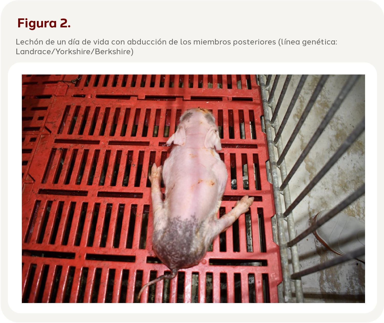 Se observan lechones con abducción muy marcada de los miembros posteriores, provocando una incapacidad de mantenerse de pie. Se dice que se observan sentados como perros, ya que se ven con las patas traseras abiertas (figura 2). En algunas ocasiones podemos observar a los lechones con abducción en ambos conjuntos de miembros, así mismo se pueden llegar a observar más de un lechón afectado por camada. Los lechones se muestran con una movilidad reducida por la debilidad en las extremidades, lo que puede llegar hasta la muerte por una inanición, esto debido a que se encuentran sobre el piso sin poder alcanzar la ubre de su madre y así poder retener el pezón (figura 3). Por otra parte, su nivel de competencia se ve reducido, lo que facilita que sea desplazado por los otros lechones dentro de su camada (Schumacher, T., et al., 2021).