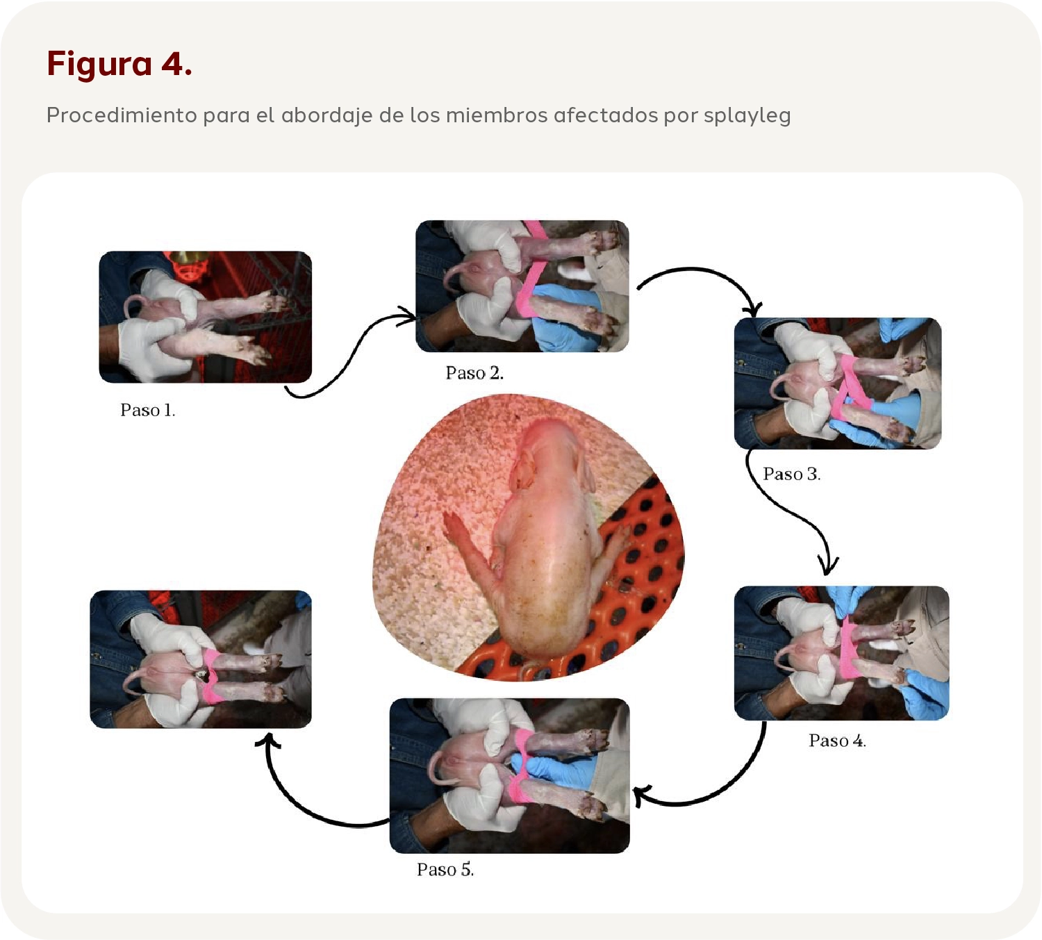 Paso 5: finalmente, se realiza un nudo entre ambos miembros para asegurar que la cinta quede firme, a su vez que garantizamos que no exista demasiada presión que afecte la circulación sanguínea de los miembros. El lechón será supervisado las horas posteriores al abordaje, revisando que no existan problemas de cianosis y otras complicaciones.