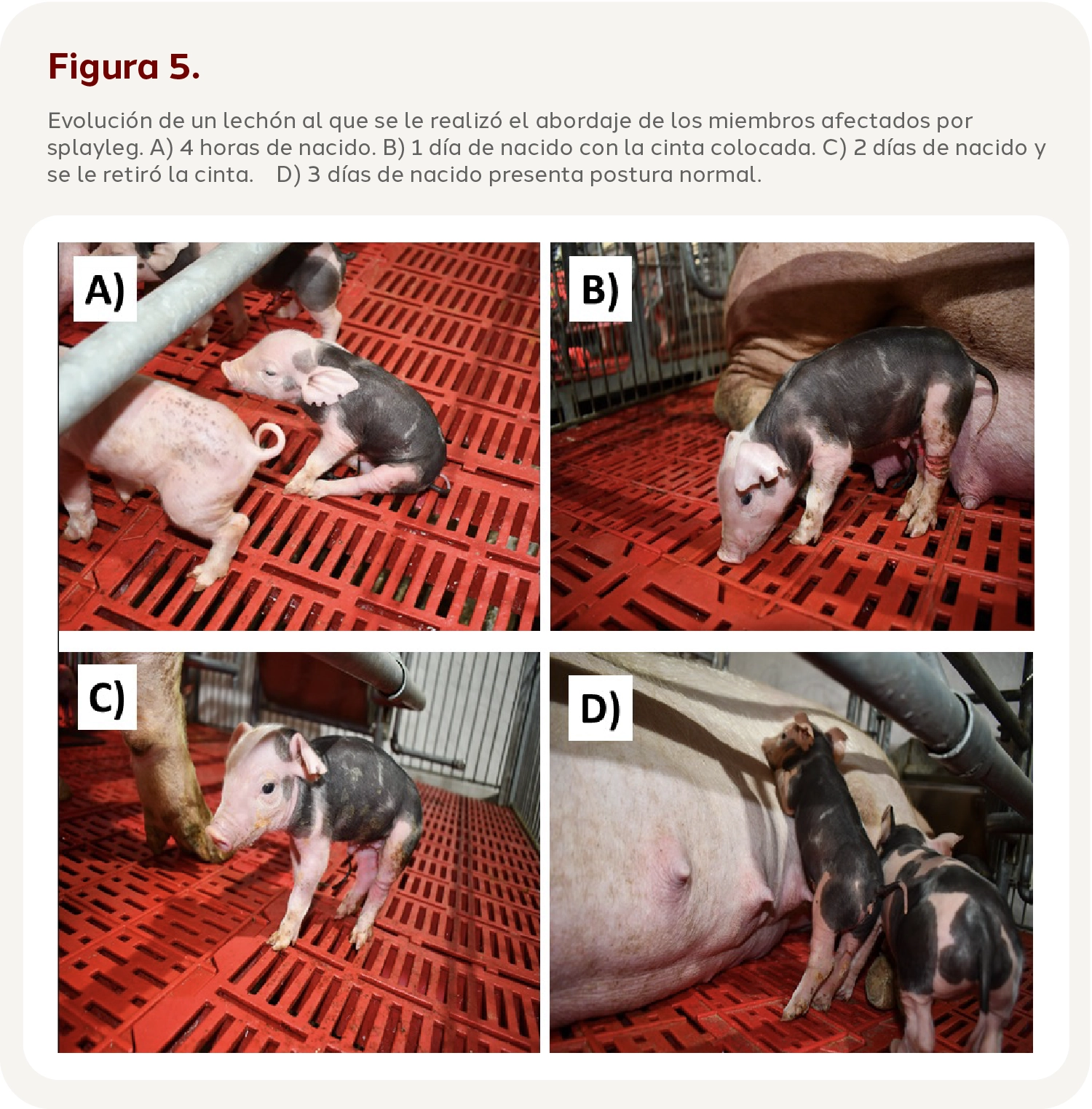Al realizar el abordaje anterior, se ayudará al lechón a mantener los miembros como se encontrarían al estar parados, lo cual unirá las fibras musculares para promover la madurez de los músculos esqueléticos de los miembros. Para ello, se recomienda que la cinta permanezca con el lechón por lo menos 24 horas posterior a su colocación. Adicionalmente, se va a favorecer la movilidad del lechón y con ello incentivar su competencia dentro de la camada para favorecer el consumo de calostro y leche durante las primeras horas de vida, esperando una mayor supervivencia.