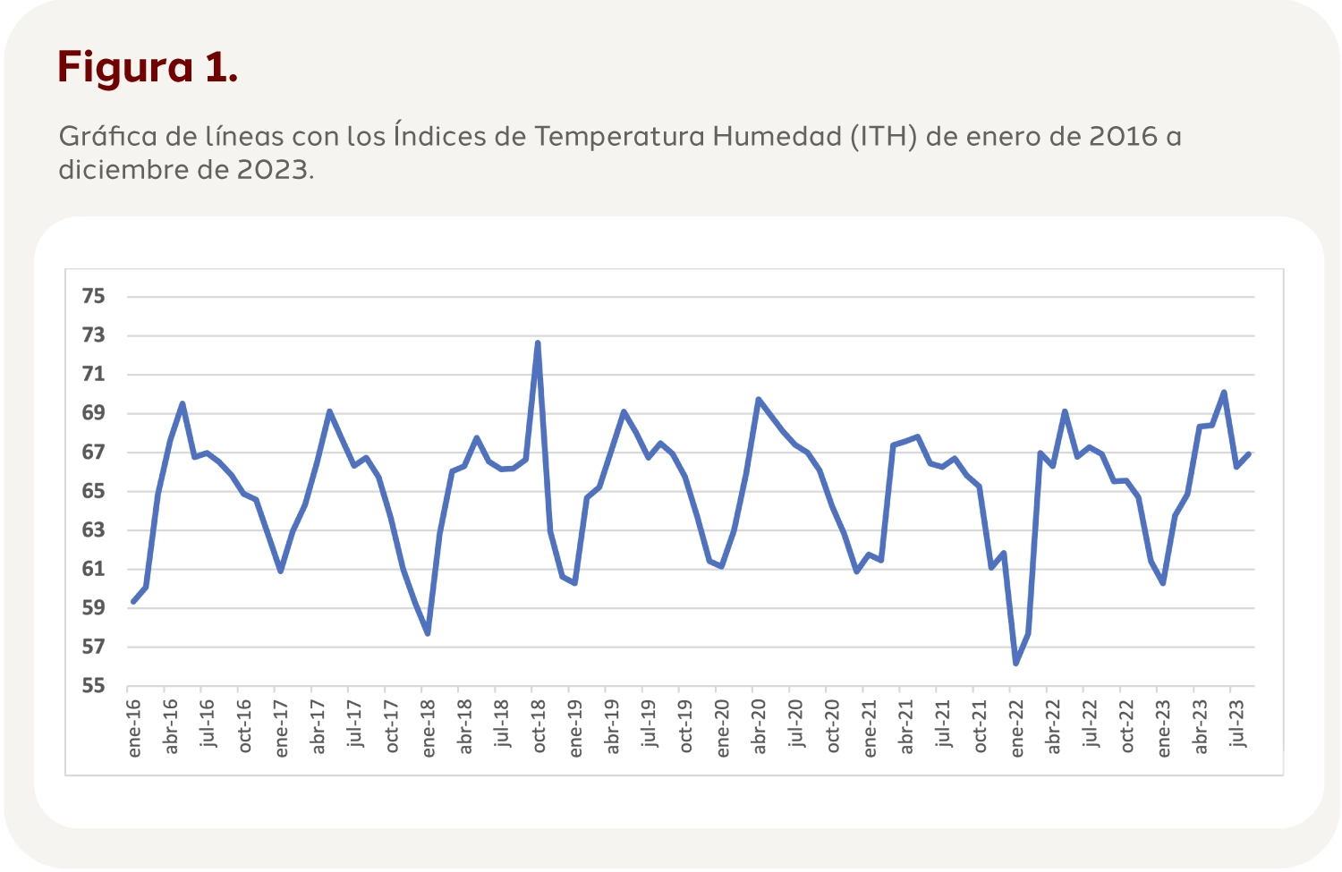 En el sitio donde se realizó el estudio, los índices de temperatura humedad (ITH) más altos oscilaron entre los meses de mayo a julio para la mayoría de los años (entre 2016 y 2023) presentándose un mayor ITH para 2018 por arriba de 72, según lo establecido por el Livestock Weather Safety Index, los valores óptimos de producción se mantienen adecuados con un ITH por debajo de 72, no fue el caso para nuestra población de estudio, ya que el promedio general oscila en 65.12 lo cual no genera cambios notorios en la producción. En la figura 1 se muestran los índices de temperatura humedad mensual promedio de los 8 años de evaluación de datos. Según Mader et al., (2006) los cerdos expuestos a un rango superior a 72 les genera estados de emergencia por lo que en nuestro caso los animales solo durante un periodo presentaron valores mayores a 72, pero no hubo afección productivas o reproductivas. El aumento de las temperaturas ambientales se sabe afecta de manera negativa a los animales (Chauhan et al., 2014), en algunos casos estas pueden ser mortales, sin embargo, no es hasta que se combina con la alta humedad relativa cuando contribuyen a elevar la sensación térmica (Parsons, 2007) y aumenta significativamente el daño. Las condiciones de temperatura y la humedad elevadas principalmente en el verano involucran un mayor riesgo de que los cerdos sean afectados por estrés calórico y esta tendencia se nota claramente en el verano, véase en la figura 1.