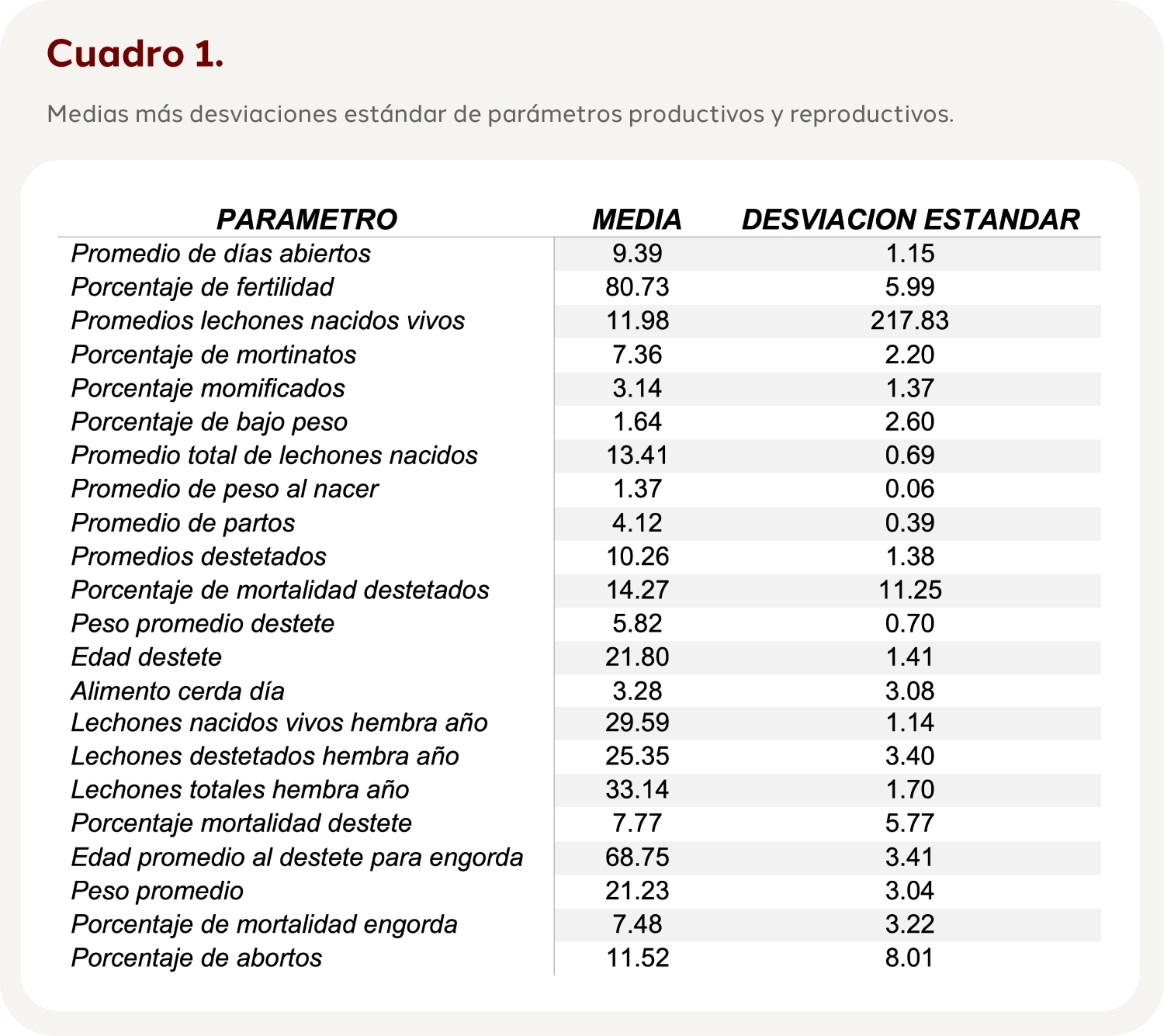 Se analizaron datos a partir del año 2016 y, hasta el año 2023, dividiéndolos por estaciones, es decir primavera (marzo-junio), verano (junio-septiembre), otoño (septiembre-diciembre), e invierno (diciembre-marzo). Los animales se encuentran estabulados en jaulas, existe de igual forma un área especial para las cerdas primerizas llamada área de cuarentena, en donde se encuentran en amplios corrales con alimento y agua a libre acceso. La dieta de las cerdas en el área de gestación consiste en un alimento balanceado (con 18% de calcio y 14% de proteína), en cerdas multíparas es de (21% de calcio y 16% de proteína). Se utilizó solamente la información reproductiva de las hembras (estro en primerizas, repetidoras y atrasadas, destetadas, días abiertos, fertilidad, mortinatos, momias, partos, promedio de lechones nacidos totales). La base de datos se trabajará en una hoja de cálculo de Excel y mediante fórmulas, se calcularán los parámetros reproductivos.