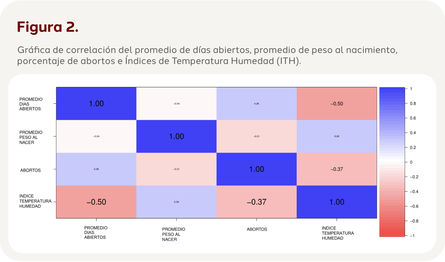 Los datos se analizaron mediante el programa R for Statistical Computer v 3.5, mediante un análisis de correlación de Pearson y un análisis de regresión lineal para determinar que variables reproductivas y productivas presentan relación con el ITH.